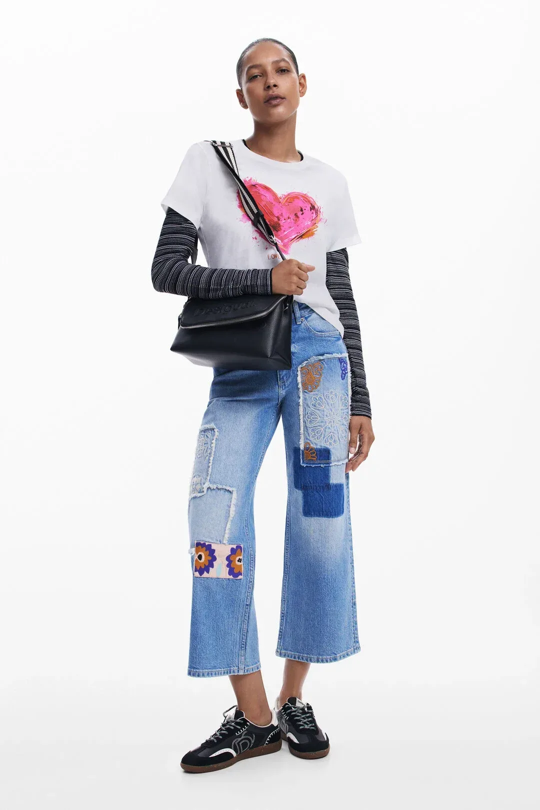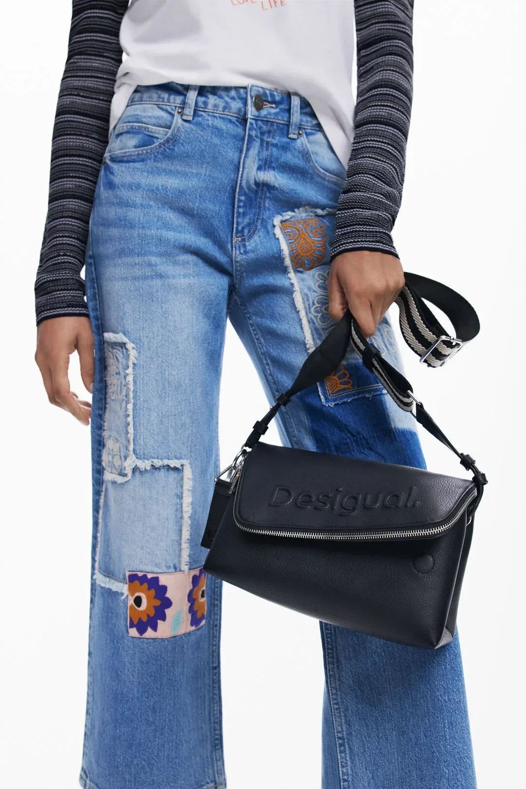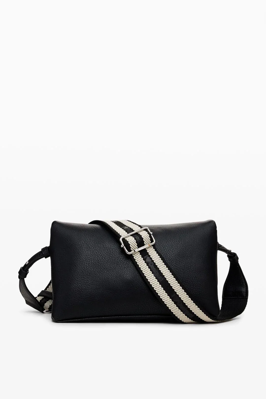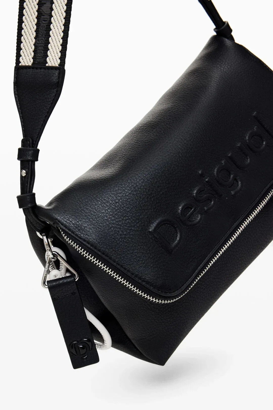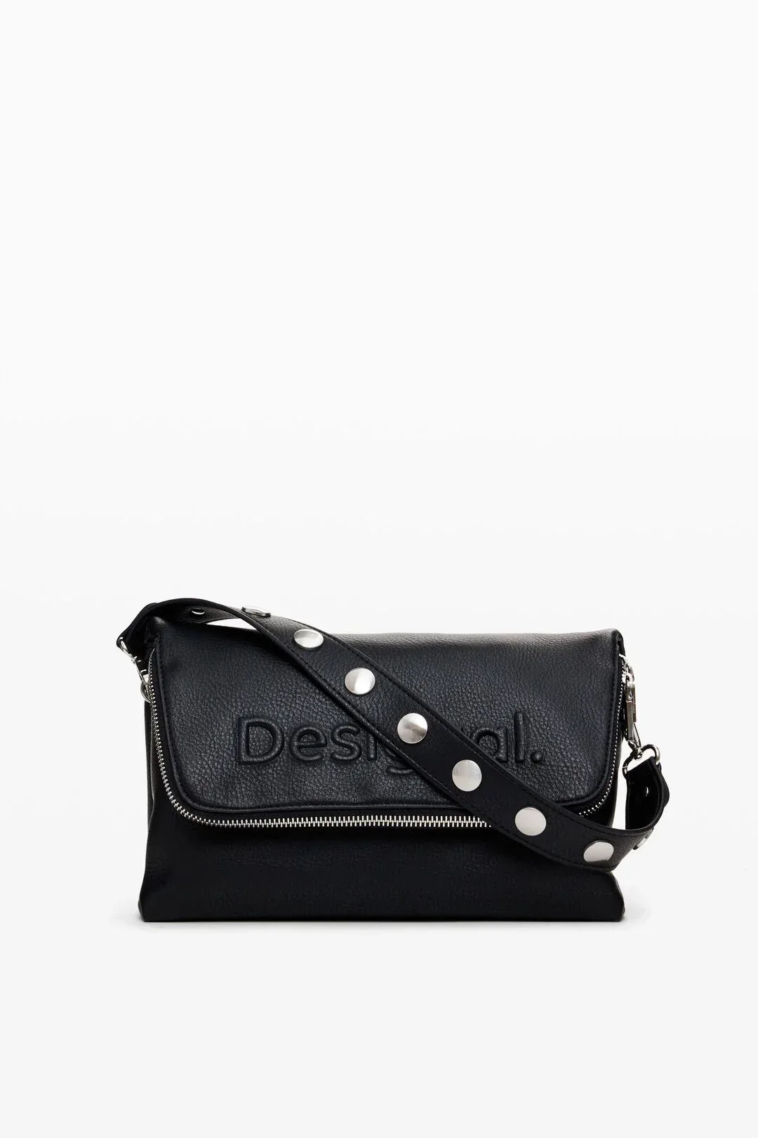 Τσάντα χιαστί μεσαίου μεγέθους από λείο faux δέρμα με ανάγλυφη λεπτομέρεια στο μπροστινό λογότυπο. Πολλαπλές δυνατότητες κρατήματος είτε στον ώμο ειτε χιαστί είτε στο χέρι, θήκες και τσέπες.