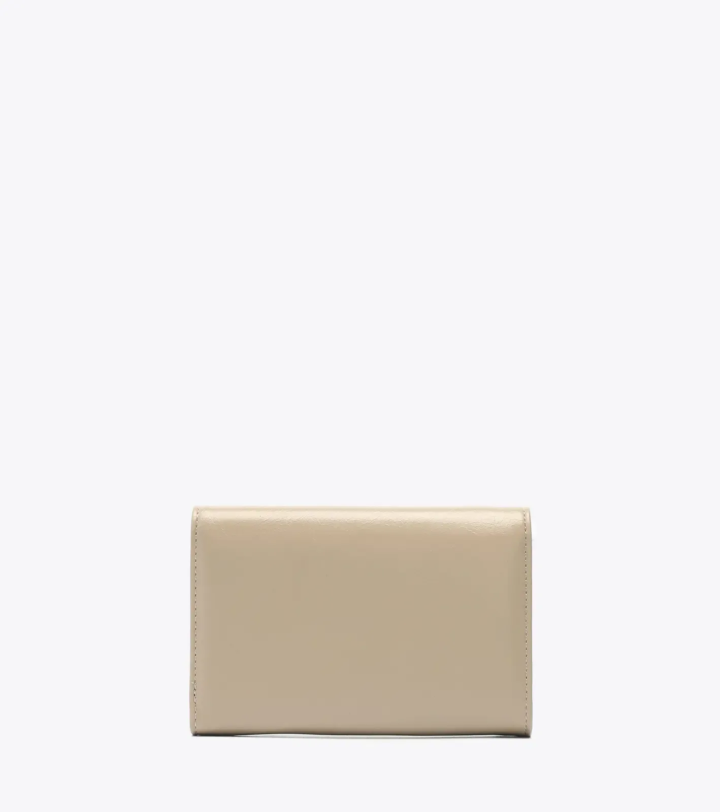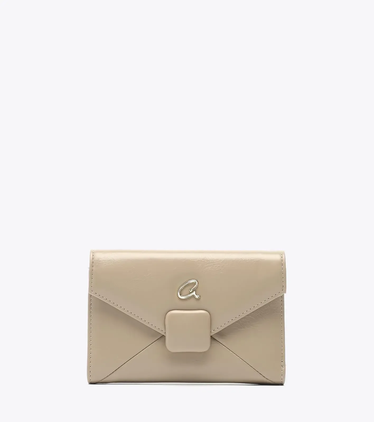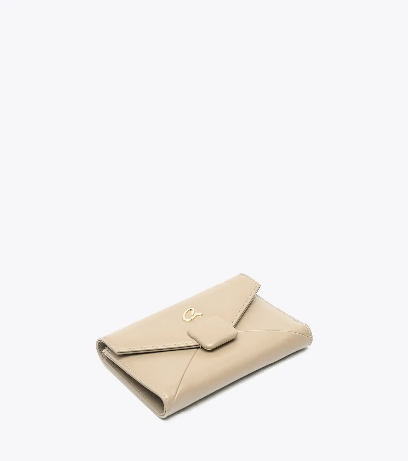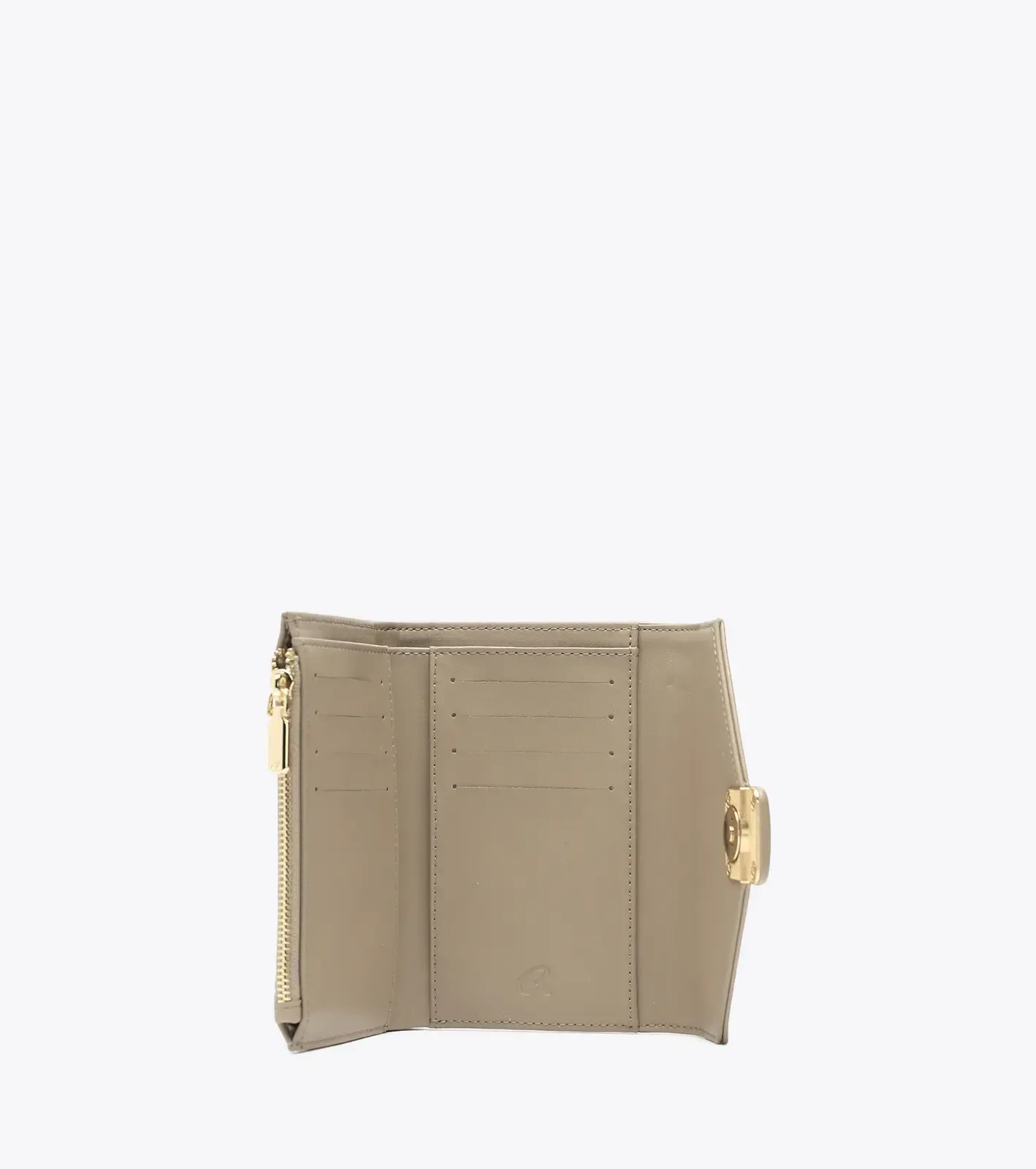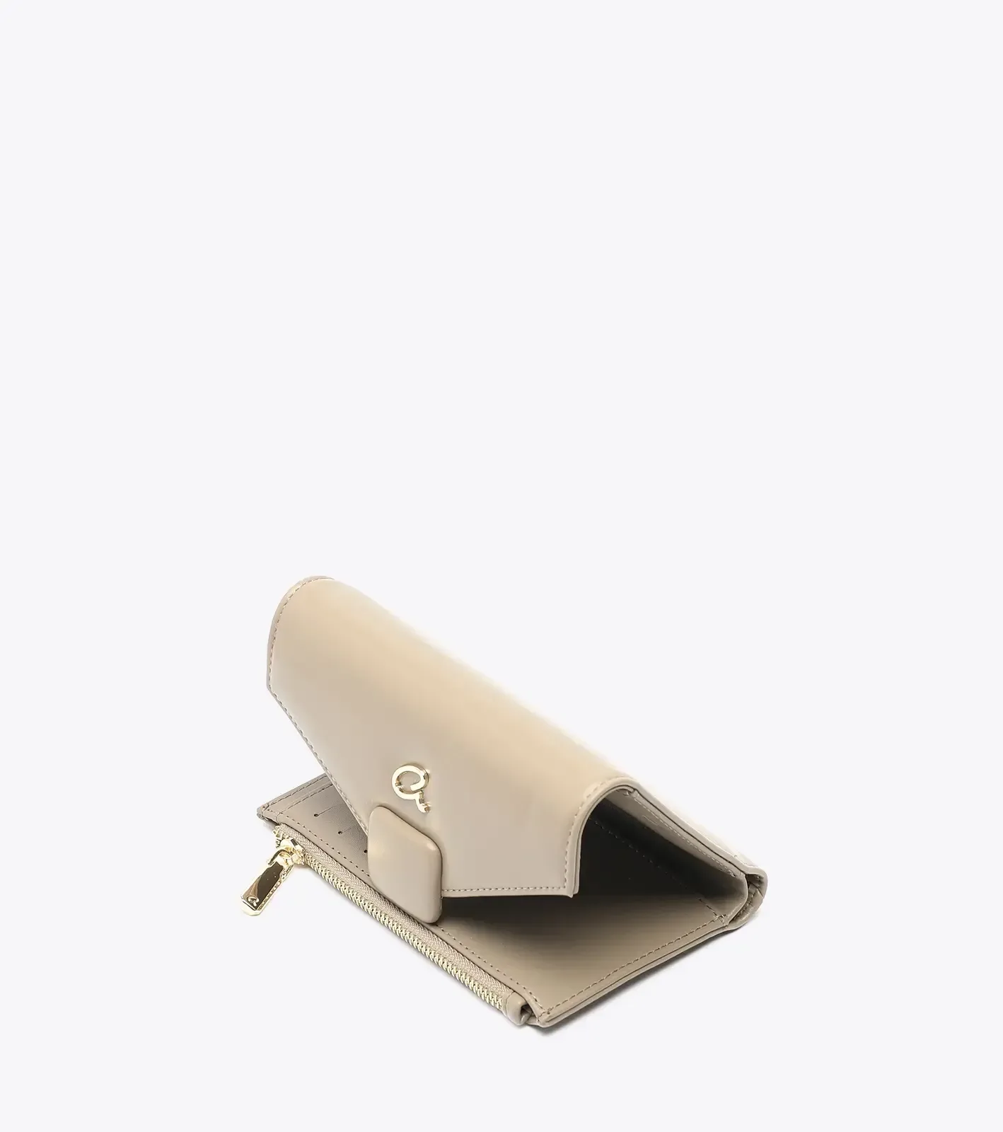 Γυναικείο πορτοφόλι που διπλώνει, σε σχήμα φακέλου, κατασκευασμένο από συνθετικό δέρμα. Κλείνει με μεταλλικό κούμπωμα και καπάκι. Διαθέτει θήκες για χαρτονομίσματα, κέρματα και κάρτες.