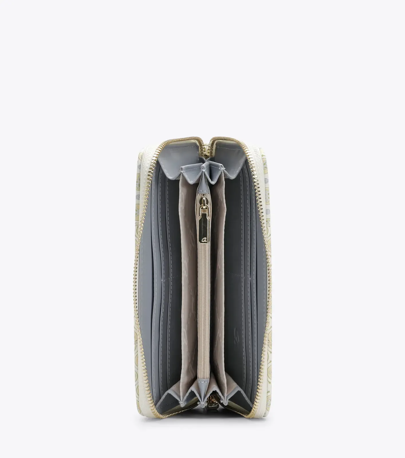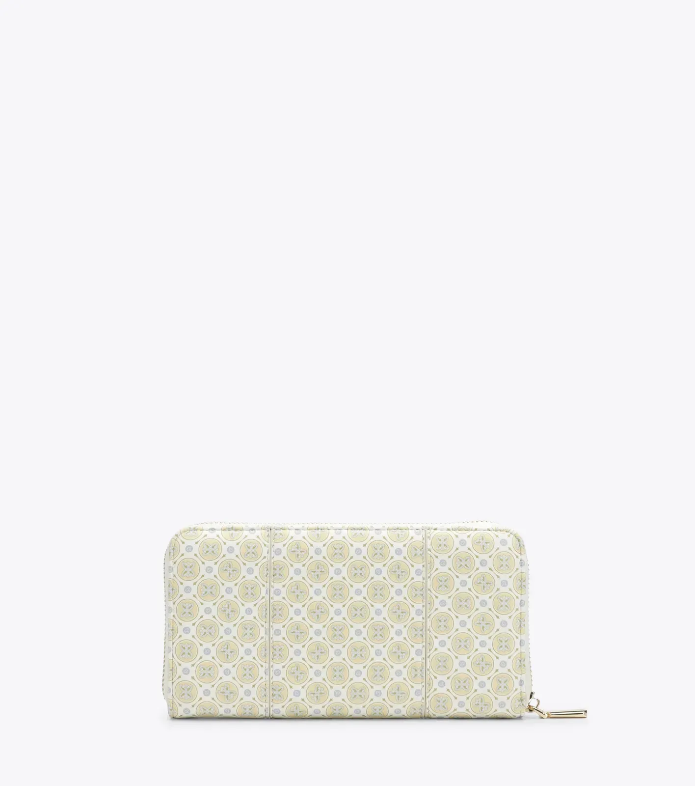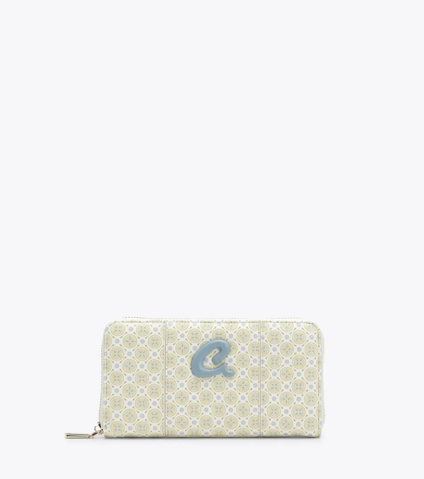 Γυναικείο πορτοφόλι Luann με επαναλαμβανόμενο τύπωμα με μοτίβο Axel. Είναι κατασκευασμένο από τεχνόδερμα και κλείνει με φερμουάρ. Εσωτερικά διαθέτει θήκη με φερμουάρ και πολλαπλές θέσεις για χαρτονομίσματα και κάρτες. Εξωτερικά διακοσμείται με προτότυπη λεπτομέρεια ‘a’ axel και ραφές που ολοκληρώνουν την εμφάνισή του. Σε μακρόστενη επίπεδη μορφή για εξοικονόμηση χώρου στη τσάντα.