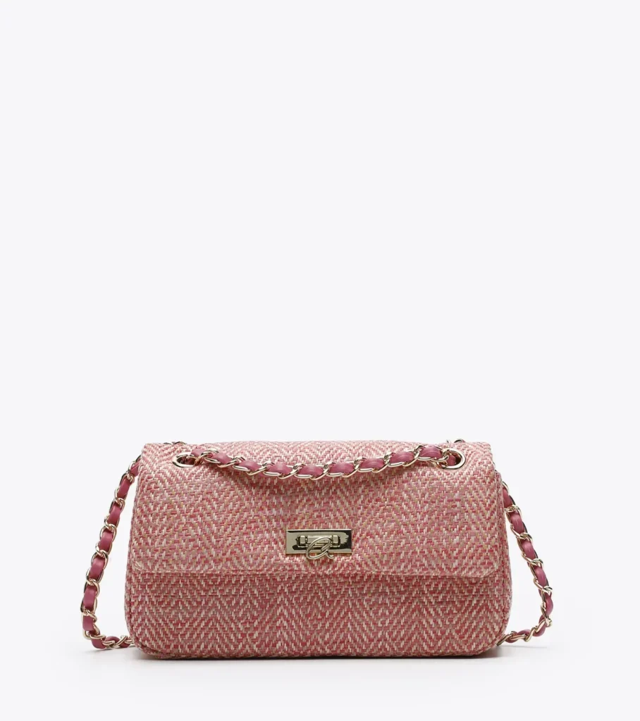 Γυναικείο χιαστί τσαντάκι Brenley με μοτίβο Aztec. Διαθέτει διπλή αλυσίδα με λεπτομέρεια από τεχνόδερμα και μπορεί να χρησιμοποιηθεί ως ώμου ή ως χιαστί. Ασφαλίζει με περίτεχνο σκαλιστό μεταλλικό κούμπωμα ‘a’ στο καπάκι. Στο εσωτερικό του περιέχει φόδρα και ένα τσεπάκι με φερμουάρ για οργάνωση. Η ψάθινη όψη του, το καθιστά το απόλυτο καλοκαιρινό αξεσουάρ για κάθε εμφάνιση.
