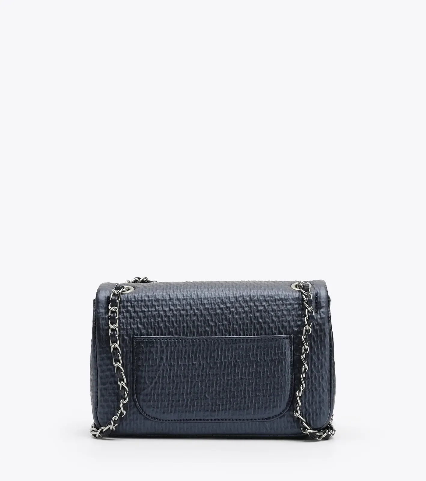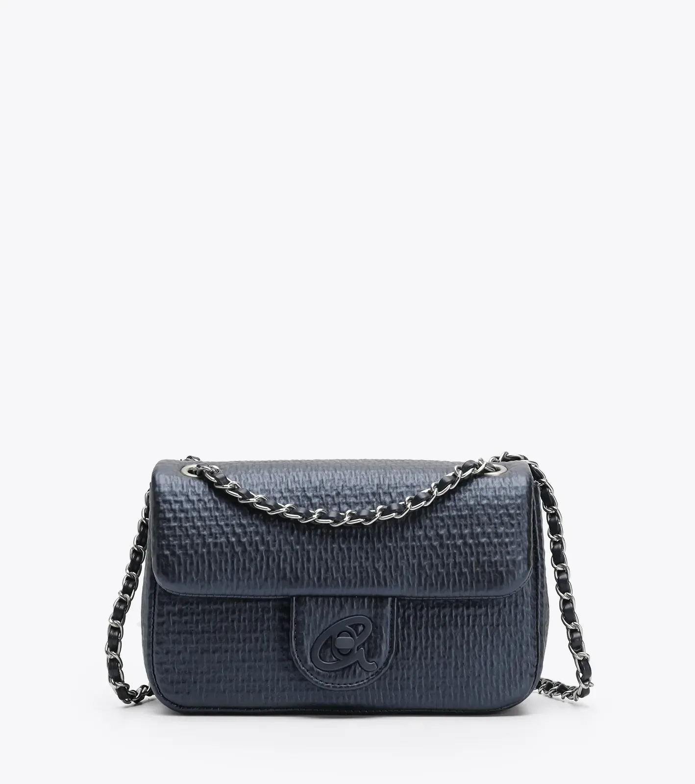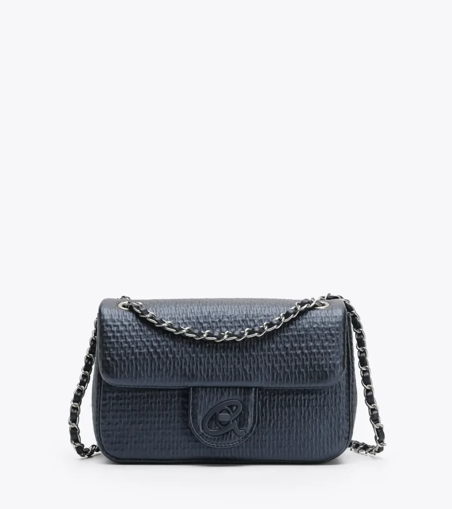 Γυναικείο τσαντάκι χιαστί Emily, κατασκευασμένο από τεχνόδερμα με ανάγλυφη υφή. Περιέχει εσωτερική τσέπη με φερμουάρ, μικρή ανοιχτή θήκη και φόδρα. Διαθέτει διπλή αλυσίδα με λεπτομέρεια από τεχνόδερμα και μπορεί να φορεθεί και ως χιαστί. Κλείνει με καπάκι και ειδικά σχεδιασμένο περιστρεφόμενο κούμπωμα ‘a’. Σε mat χρωματική απόχρωση που ξεχωρίζει.