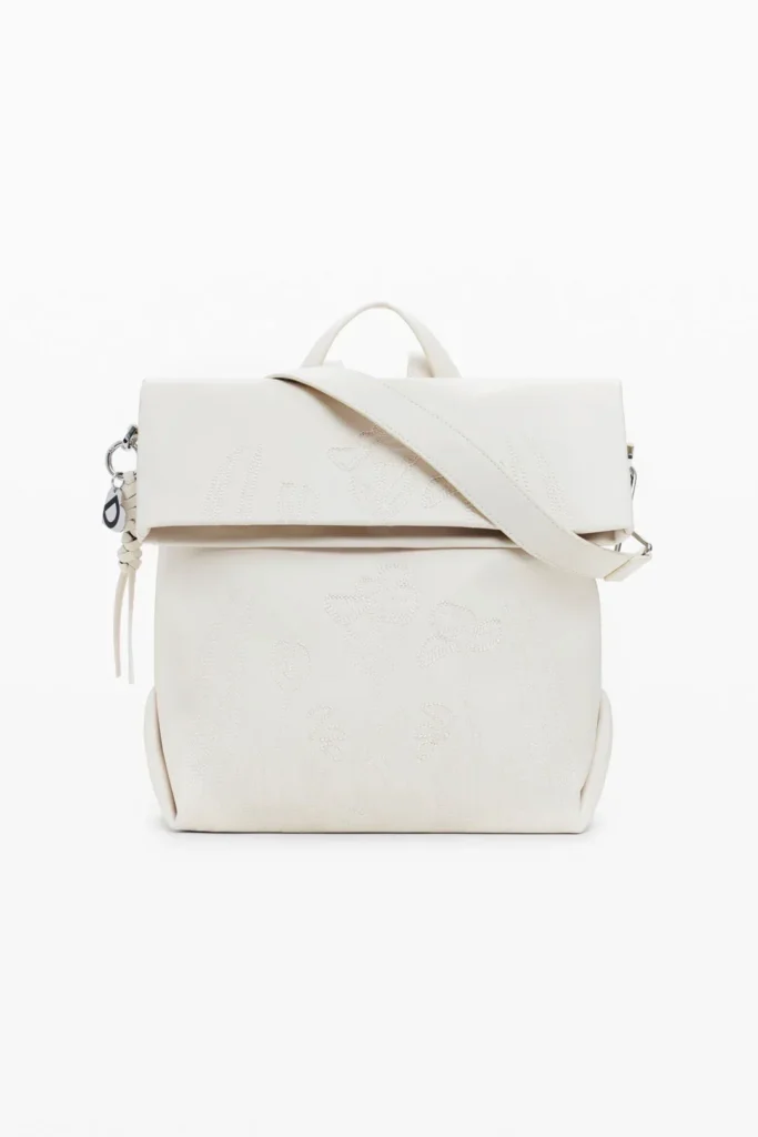 Σακίδιο πλάτης σε τεχνόδερμα, με επεκτάσιμο καπάκι, αποσπώμενη λαβή, εξωτερική πίσω τσέπη και κεντημένες λεπτομέρειες σε μεταλλικό εφέ. Φοριέται και στον ώμο με αποσπώμενο λουρί.