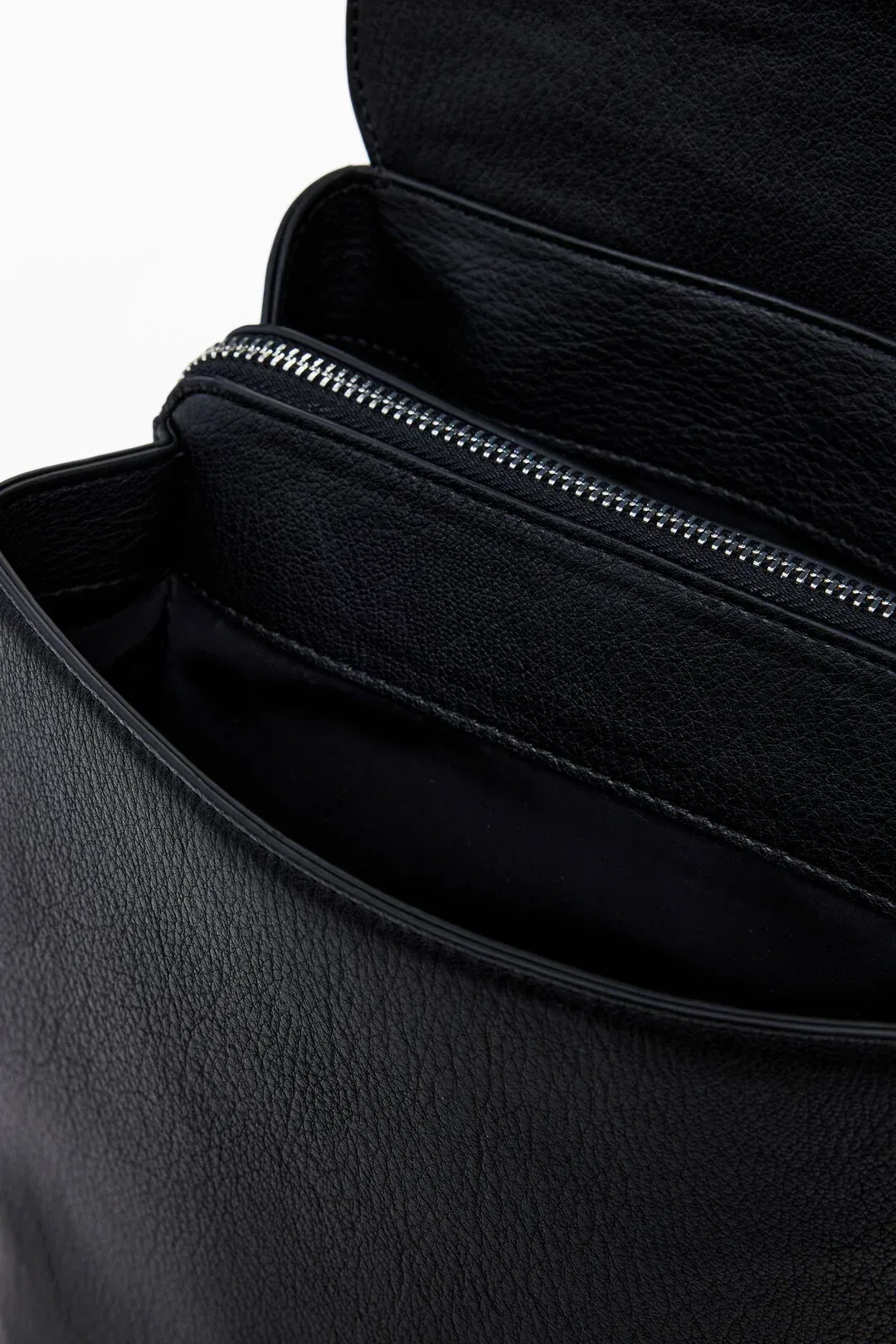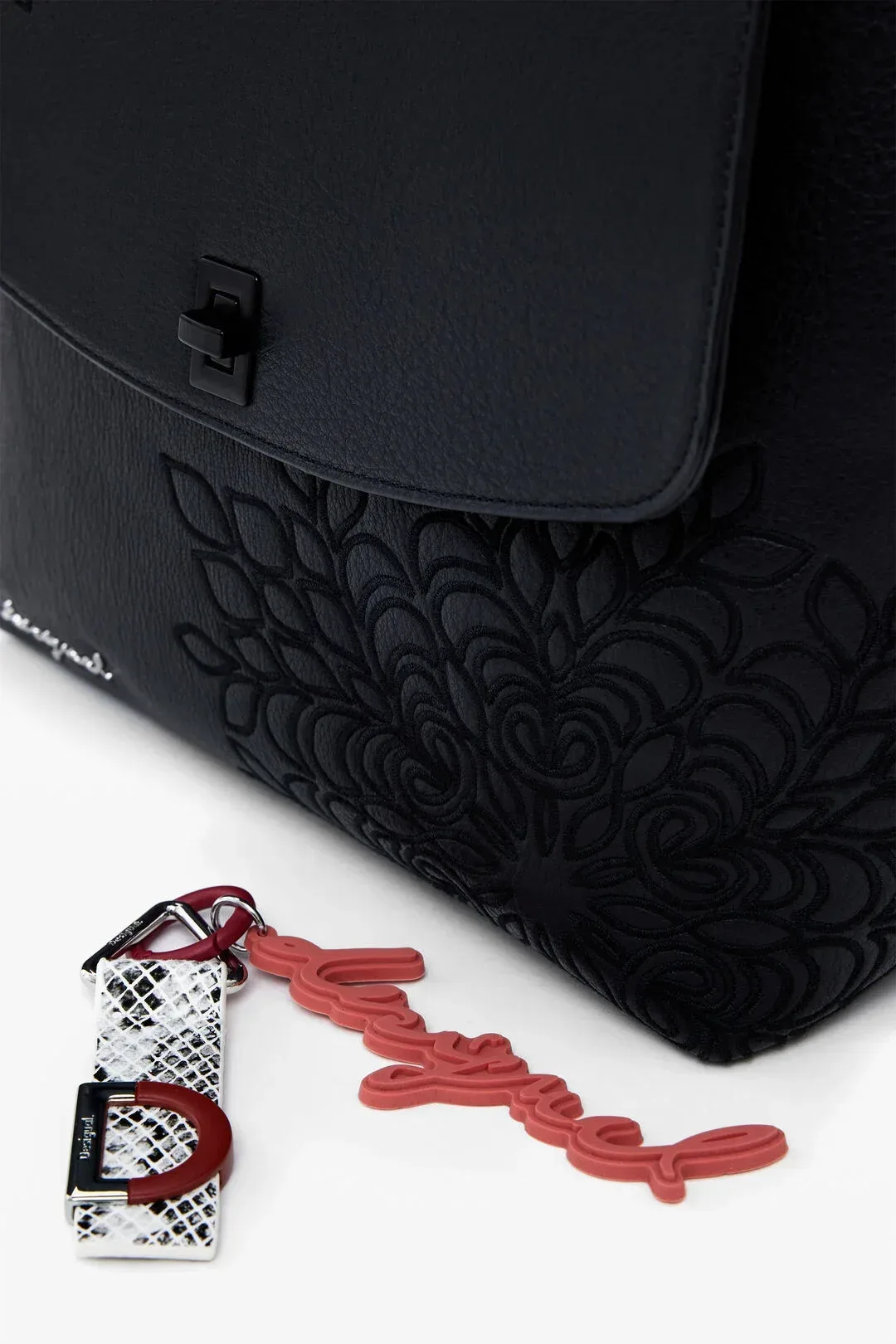 Μικρό σακίδιο πλάτης από δερματίνη με χαραγμένες λεπτομέρειες μάνταλα, κλείσιμο με φερμουάρ και μεγάλο καπάκι με αποσπώμενο χερούλι που μετατρέπεται σε τσάντα.