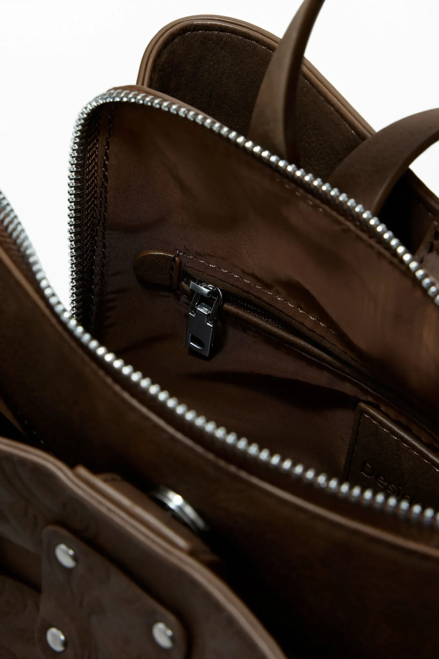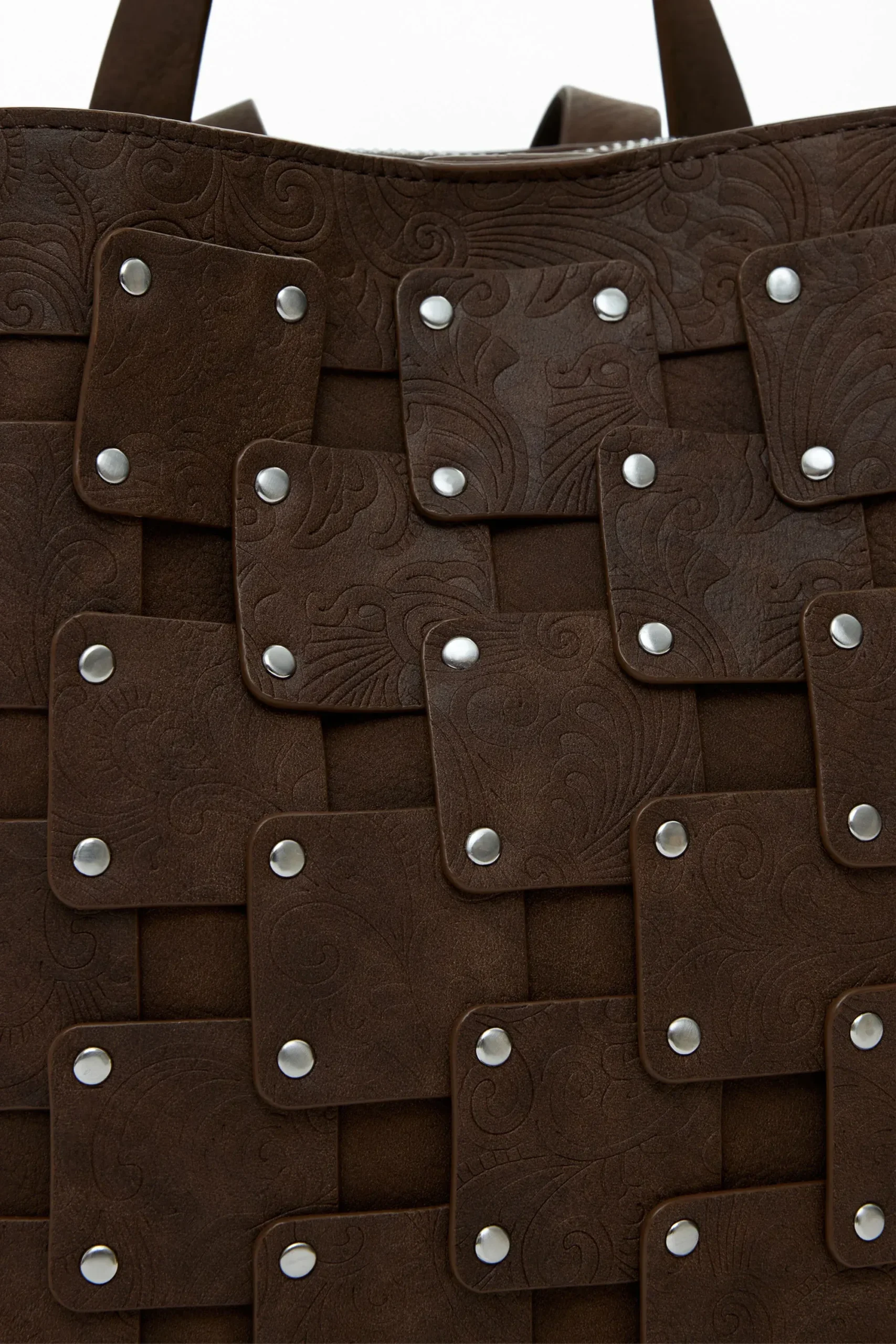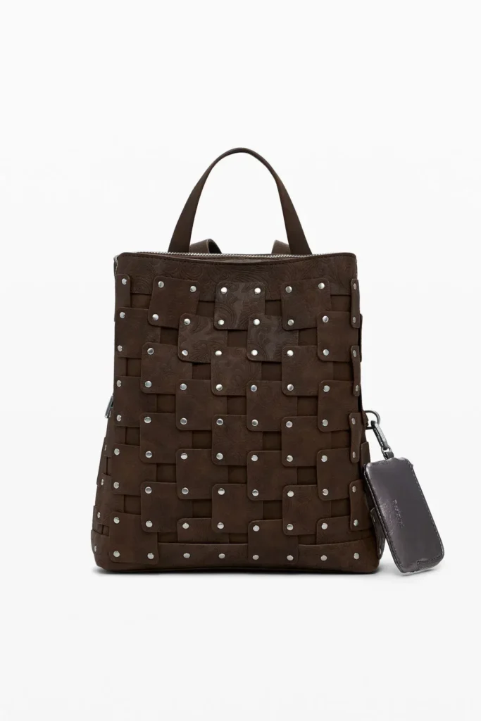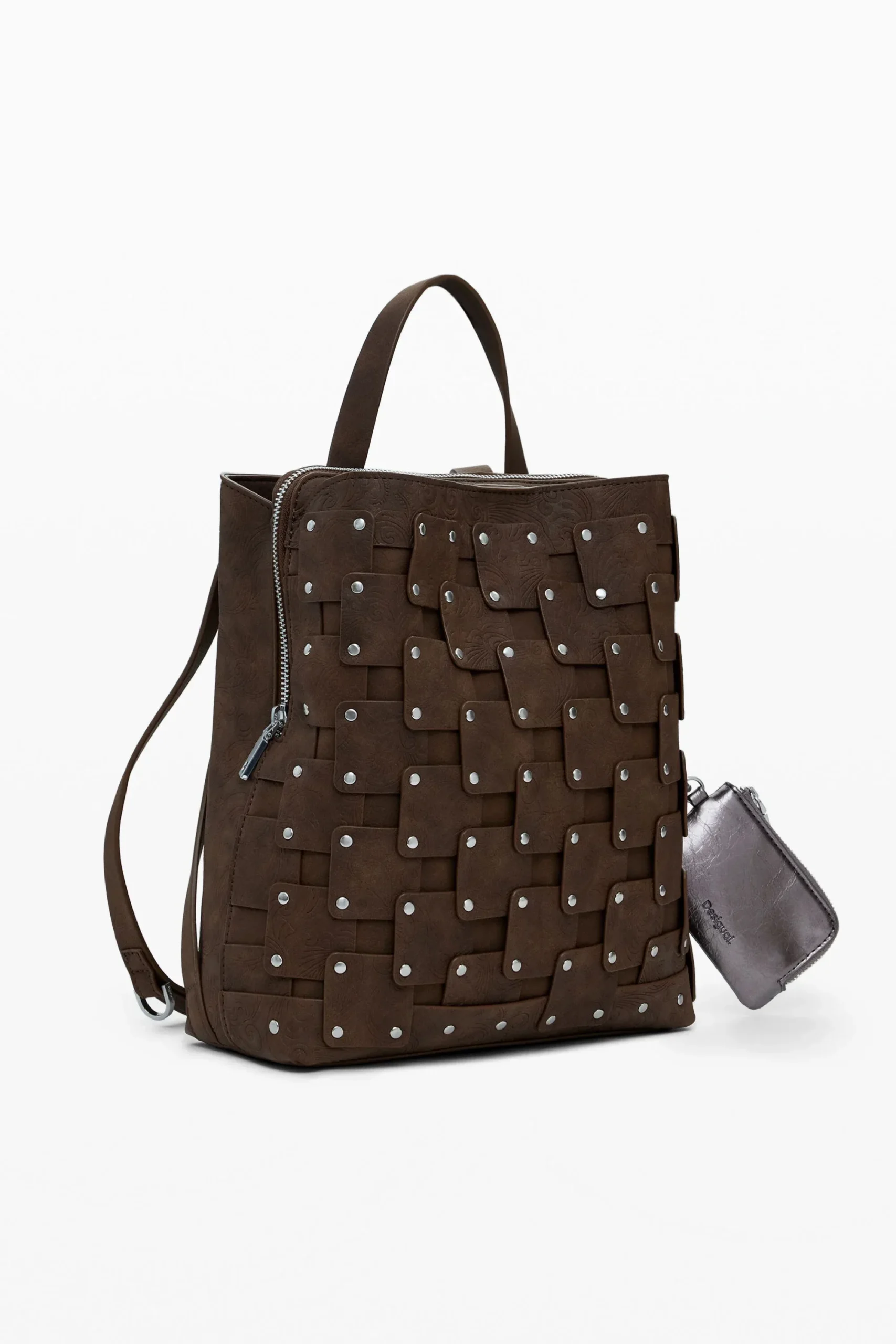 Μεσαίο σακίδιο πλάτης από συνθετικό δέρμα που αποτελείται από πολλαπλά τετράγωνα μπαλώματα, με μεταλλικό φινίρισμα με καρφιά και αποσπώμενο μεταλλικό μπρελόκ από συνθετικό δέρμα.
