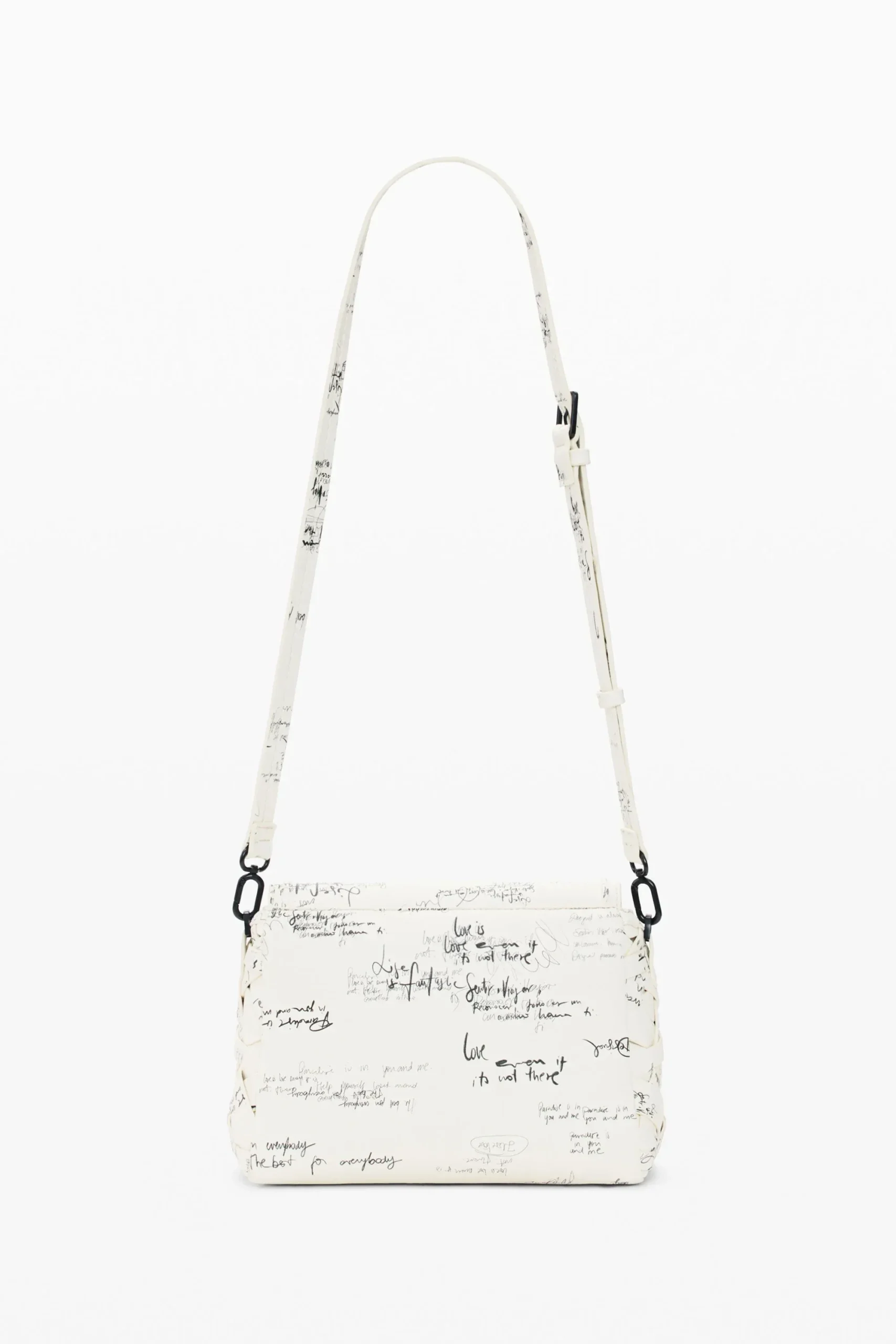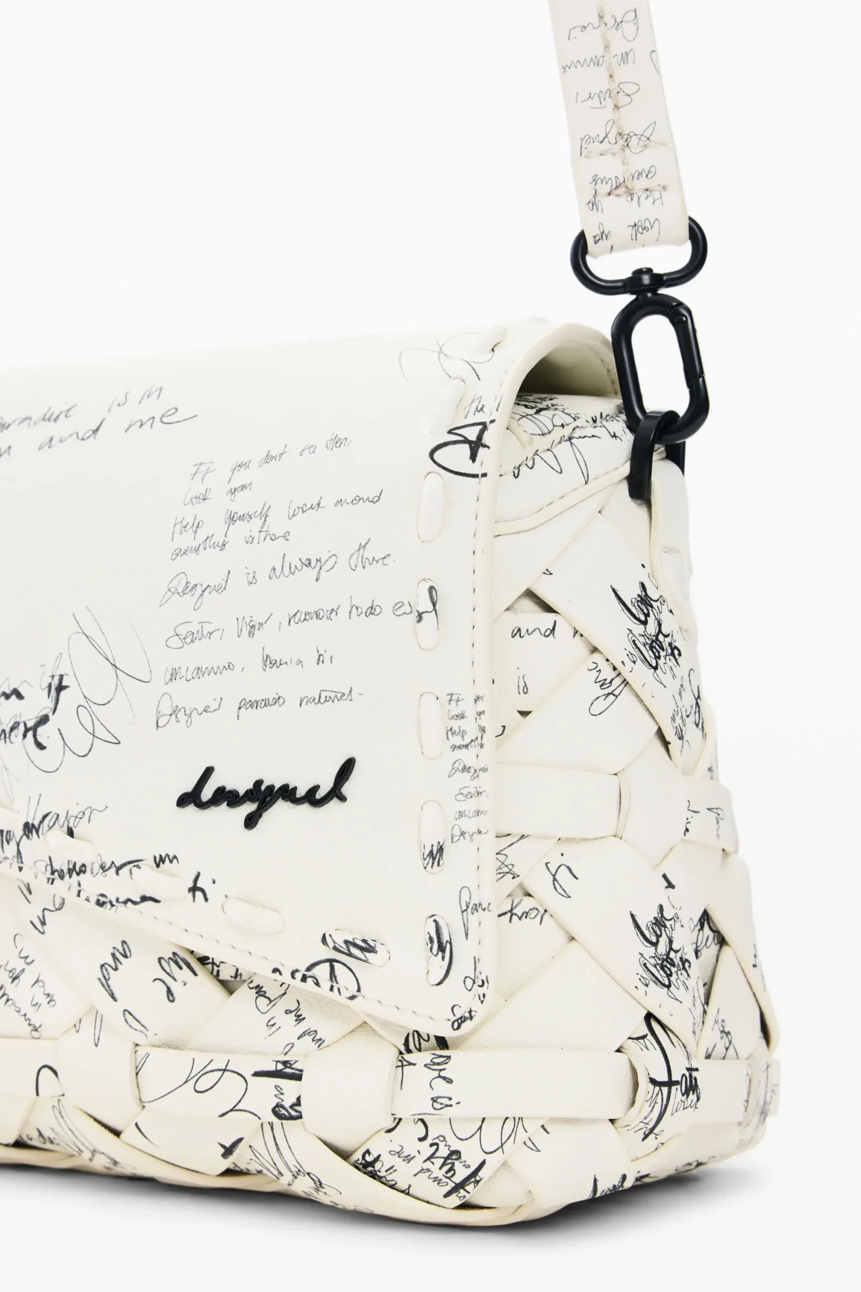 Μεσαία τσάντα με καπάκι, πλεκτές λεπτομέρειες, τύπωμα σε στυλ lettering, εναλλάξιμα λουράκια και καπάκι.