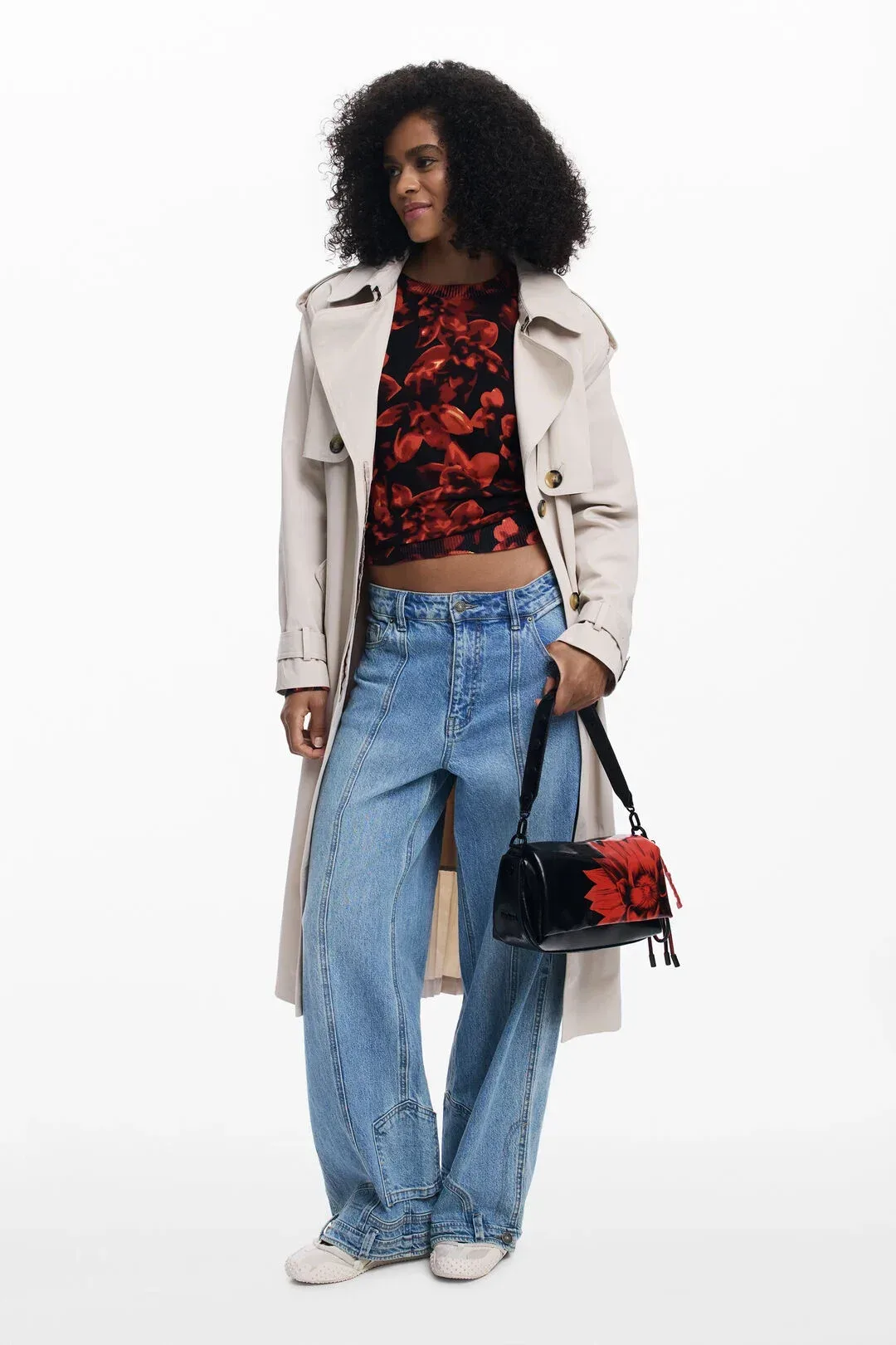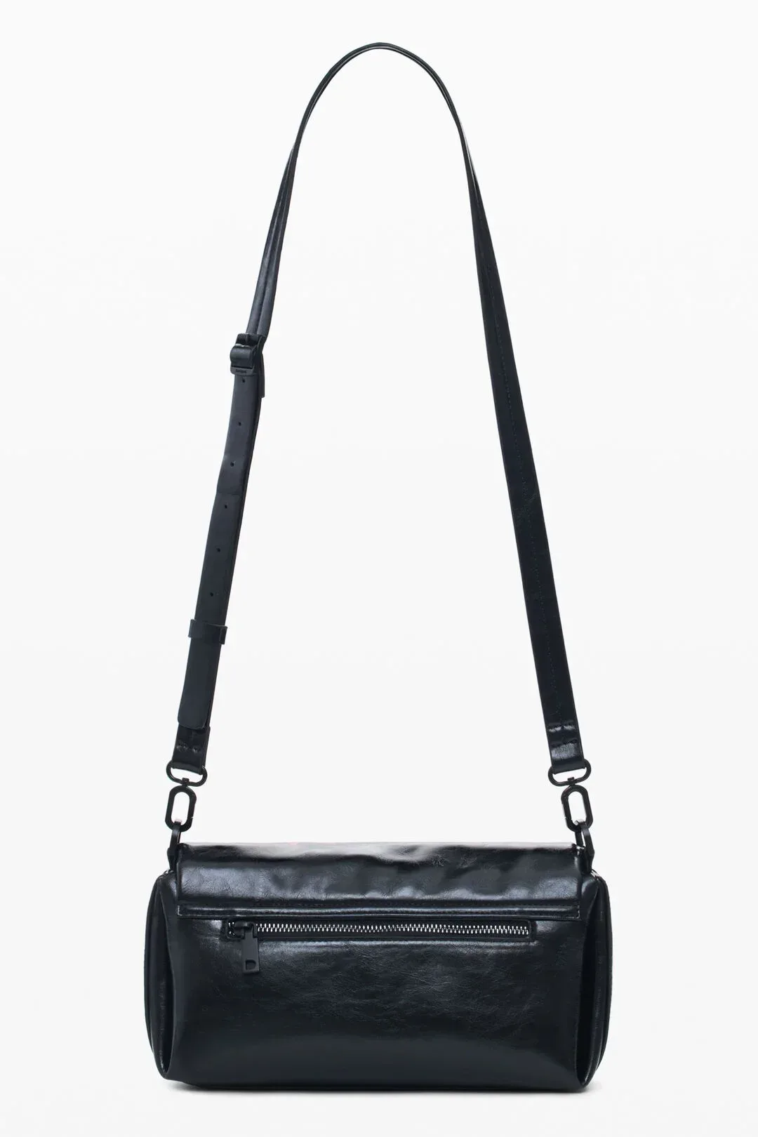 Τσάντα χιαστί σε όψη δέρματος με γυαλιστερό φινίρισμα, μονόχρωμη με μεγάλο τύπωμα λουλουδιών, καπάκι, εναλλάξιμα χερούλια και αποσπώμενο μπρελόκ.