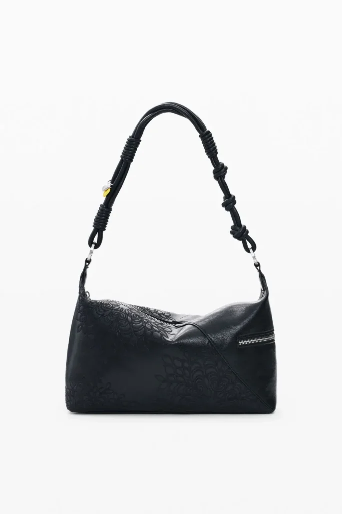 Μεσαία τσάντα με εναλλάξιμα χερούλια, charm λεπτομέρειες και κέντημα μάνταλα σε όψη δέρματος.