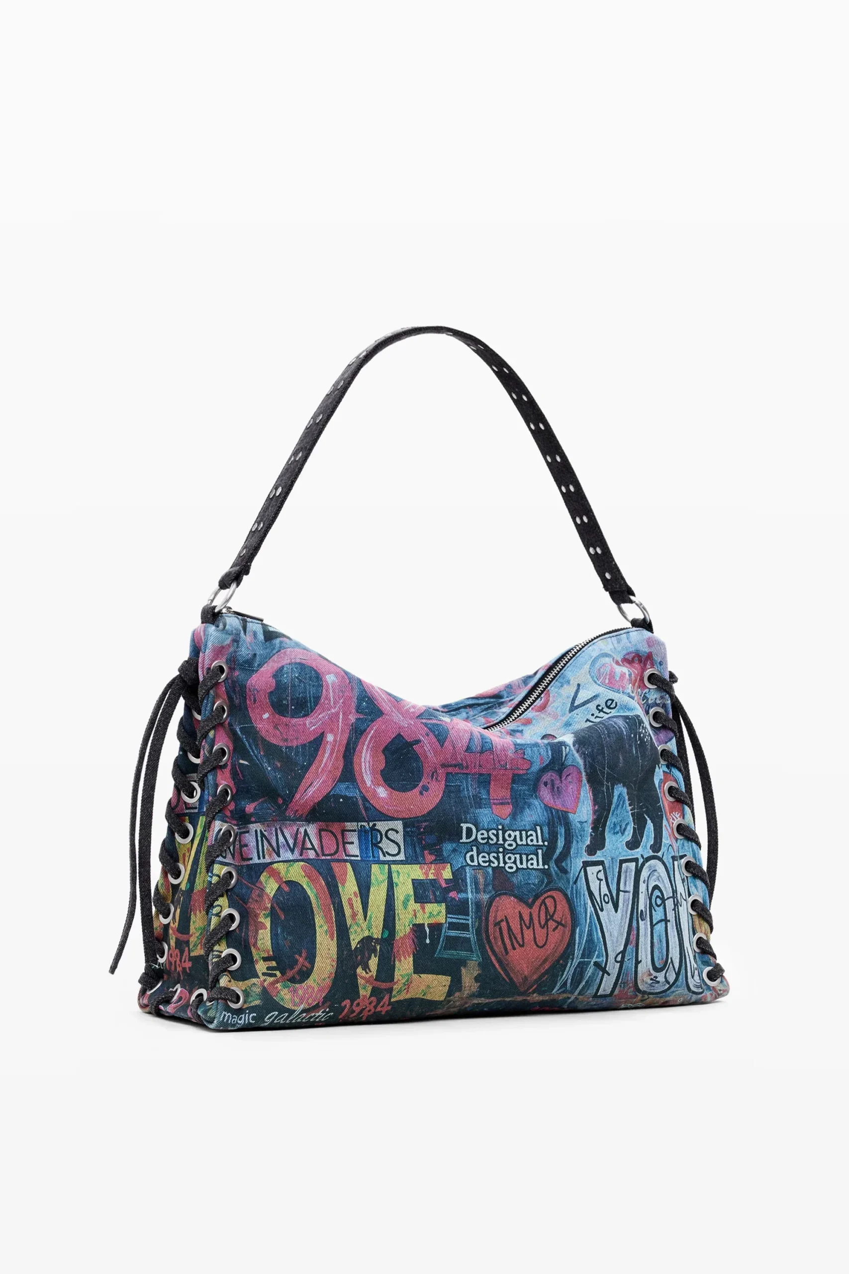 Τσάντα ώμου μεγάλου μεγέθους από τζιν ύφασμα με τύπωμα σε στυλ γκράφιτι, εναλλάξιμα χερούλια και πλεκτές λεπτομέρειες στα πλαϊνά.