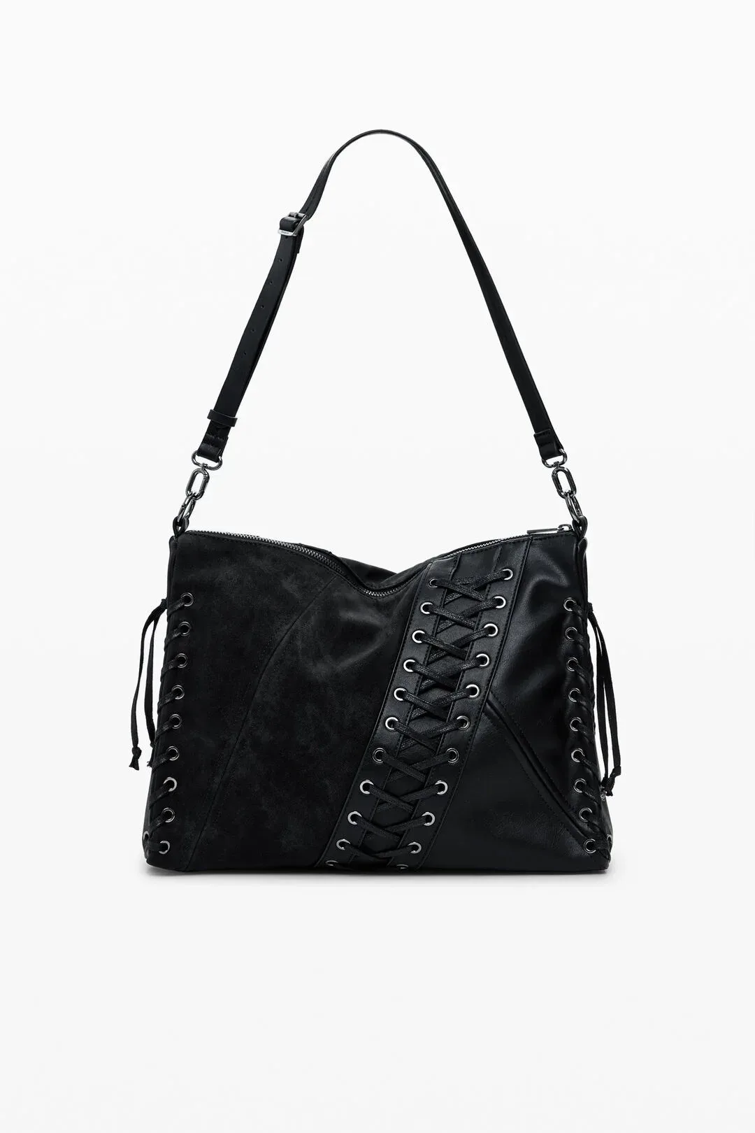 Τσάντα ώμου σε συνθετικό δέρμα με λεπτομέρεια χιαστί λουράκι σε στυλ κορσέ, εναλλάξιμα χερούλια και κλείσιμο με φερμουάρ.