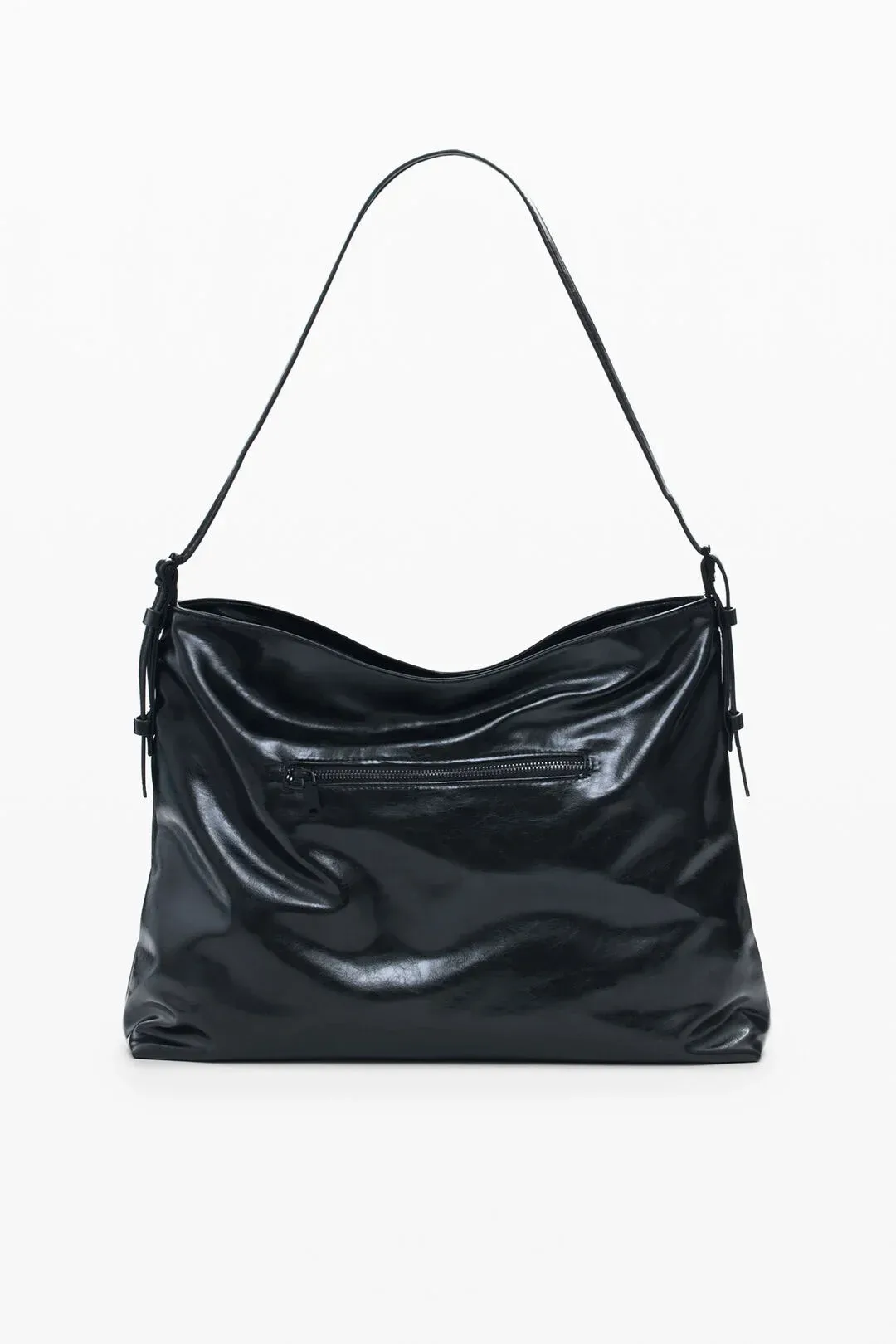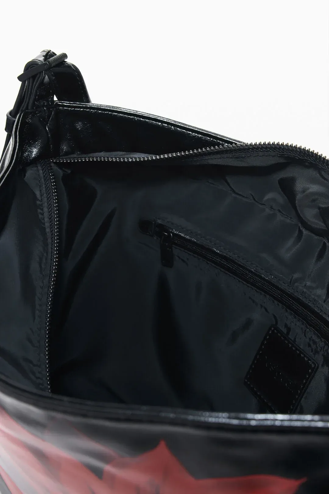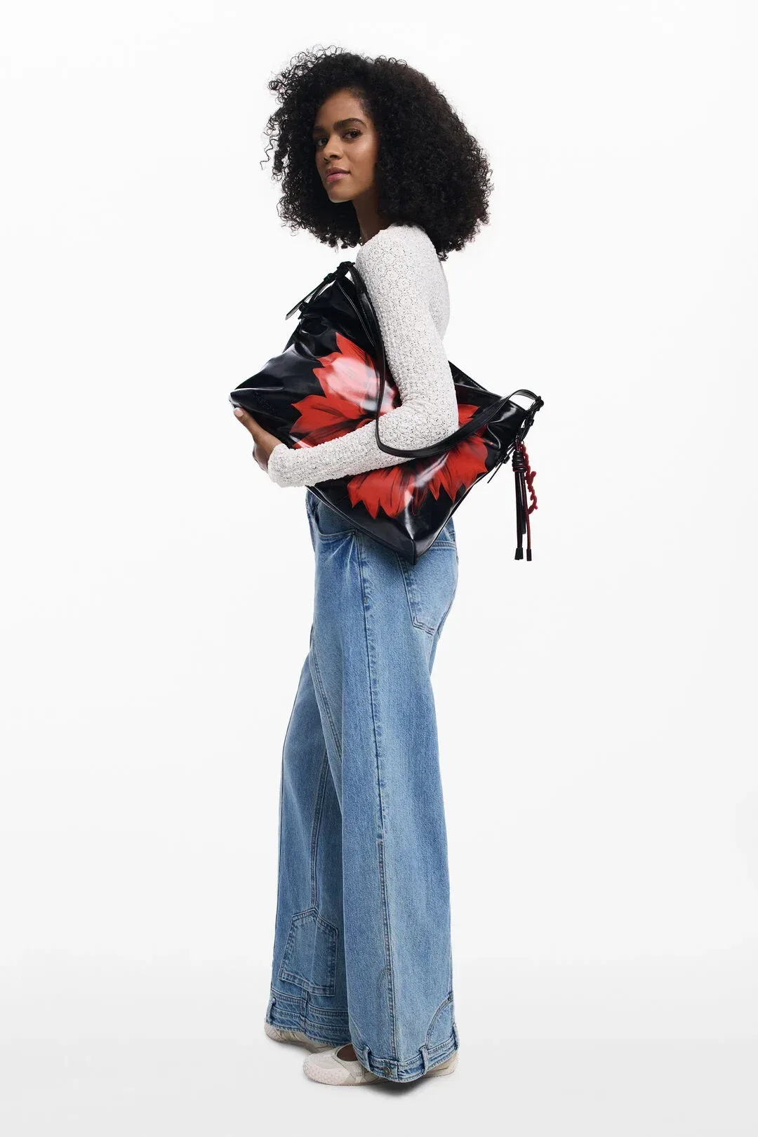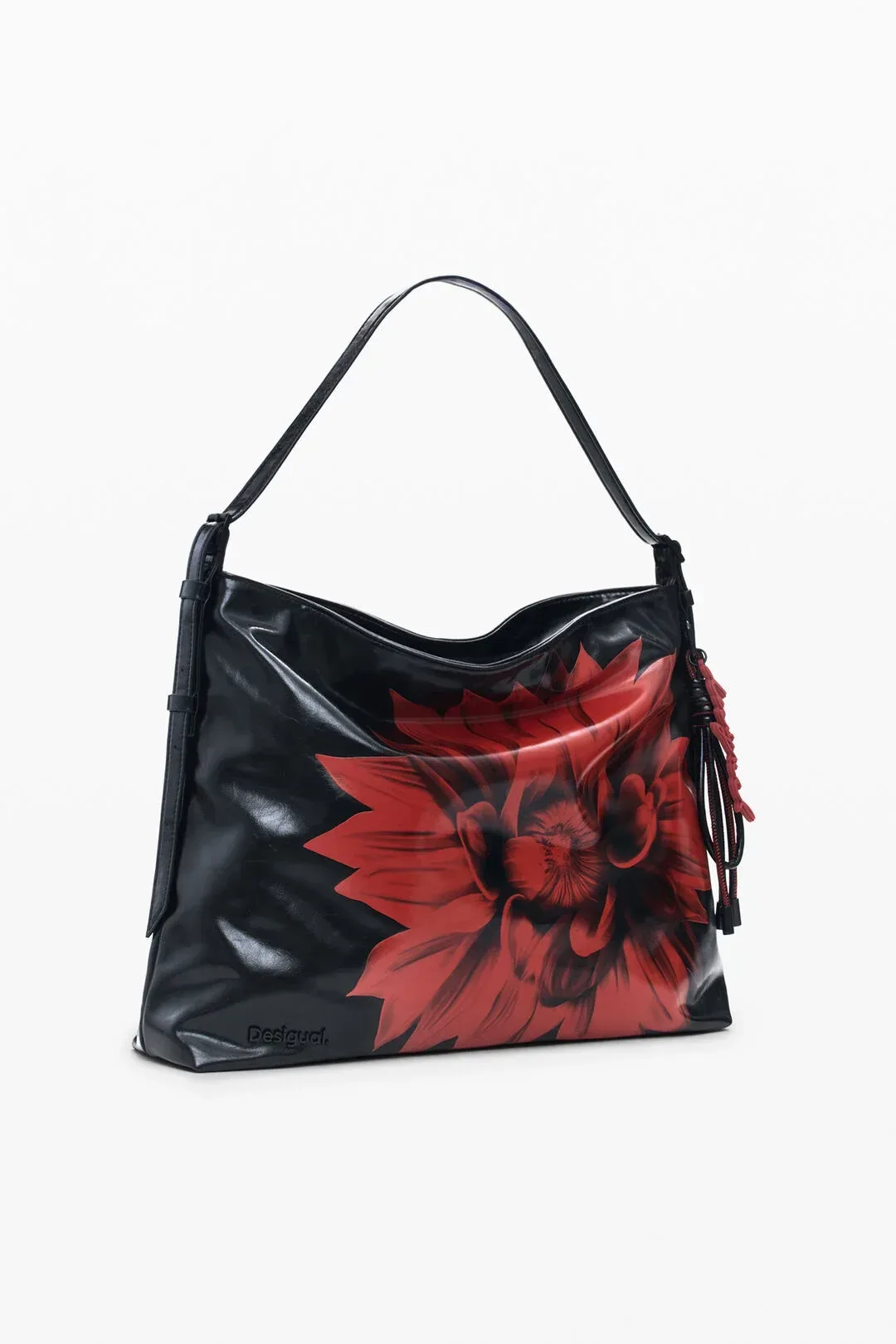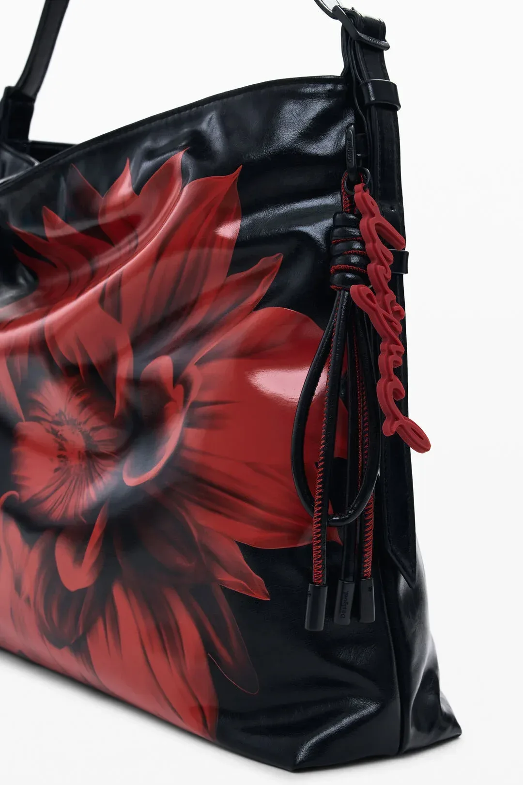 Τσάντα ώμου σε όψη δέρματος με γυαλιστερό τελείωμα, μονόχρωμη με μεγάλο τύπωμα λουλουδιών, ρυθμιζόμενο λουράκι και αποσπώμενο μπρελόκ.