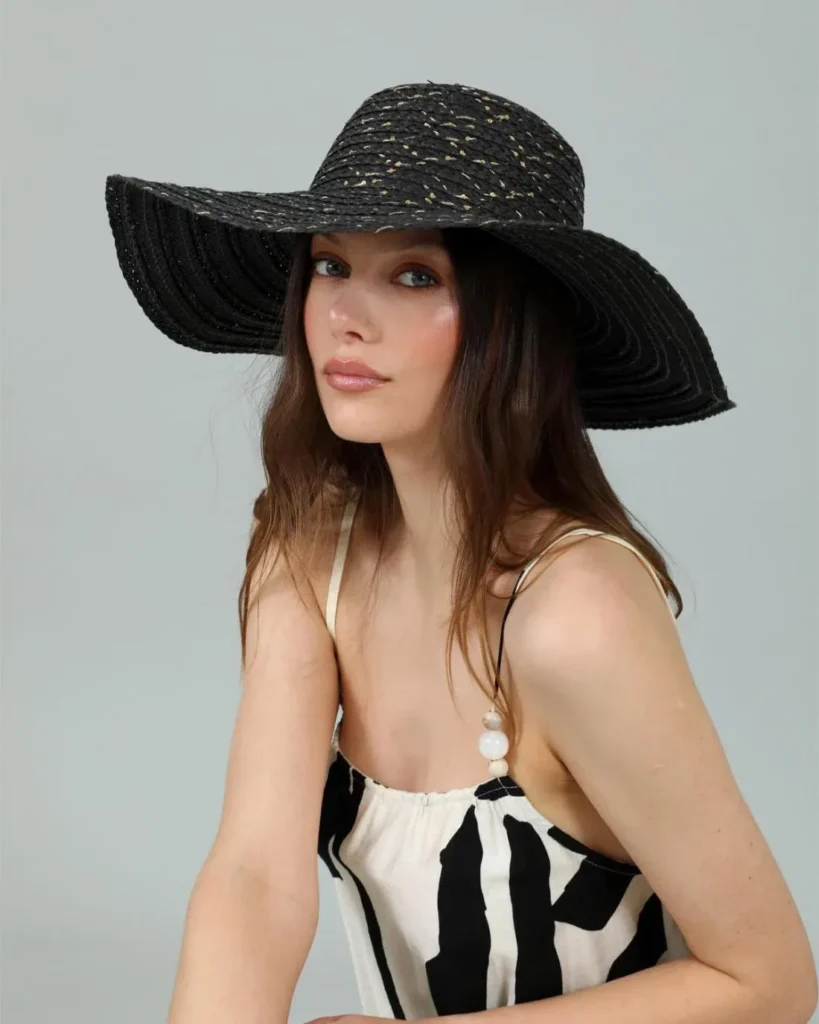 Ψάθινo καπέλο σε μαύρο χρώμα με χρυσές πούλιες. Κατασκευασμένο από 100% ψάθα.