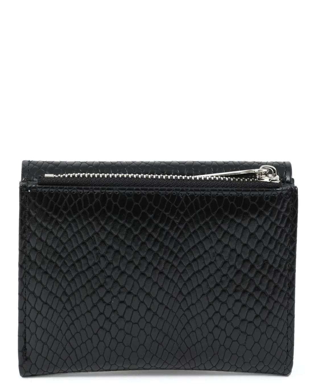 Πορτοφόλι σε μαύρο χρώμα με εξωτερική τσέπη, υφή φίδι και κλείσιμο με καπάκι. Κατασκευασμένο από συνθετικό δέρμα.
