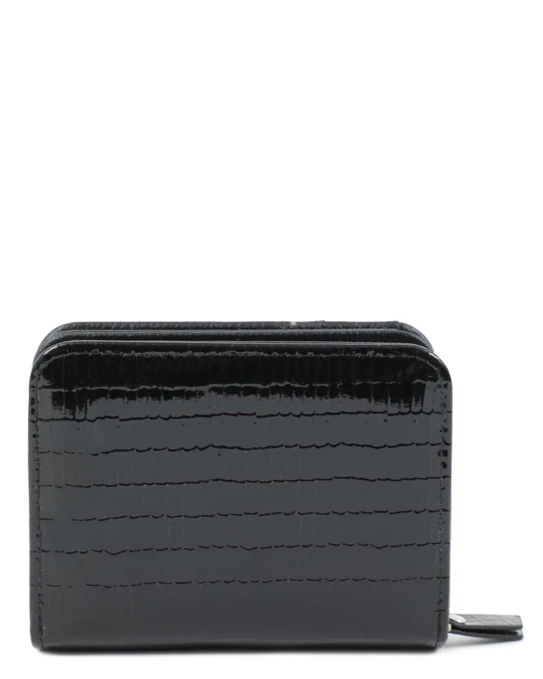 Πορτοφόλι σε μαύρο χρώμα με κροκό υφή και διακοσμητικές λεπτομέρειες. Κατασκευασμένο από συνθετικό δέρμα.