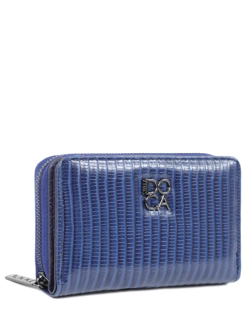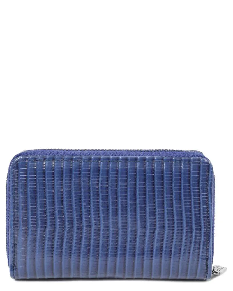 Πορτοφόλι σε μπλε χρώμα με υφή φίδι. Κατασκευασμένο από συνθετικό δέρμα. Παραλαμβάνεται μέσα σε επαναχρησιμοποιούμενο κουτί DOCA.