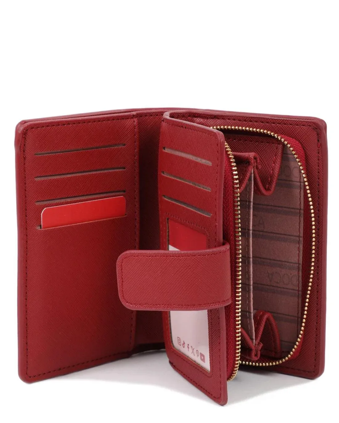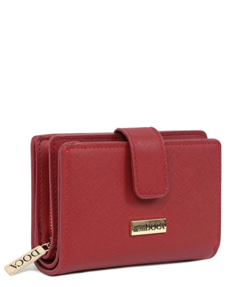 Πορτοφόλι σε μπορντώ χρώμα με κλείσιμο με καπάκι. Κατασκευασμένο από συνθετικό δέρμα. Παραλαμβάνεται μέσα σε επαναχρησιμοποιούμενο κουτί DOCA.