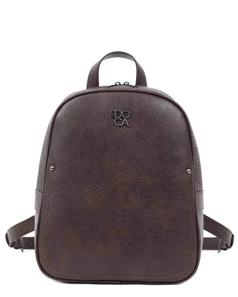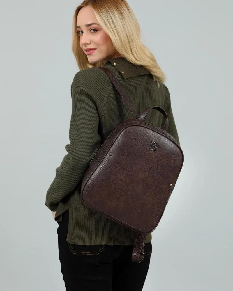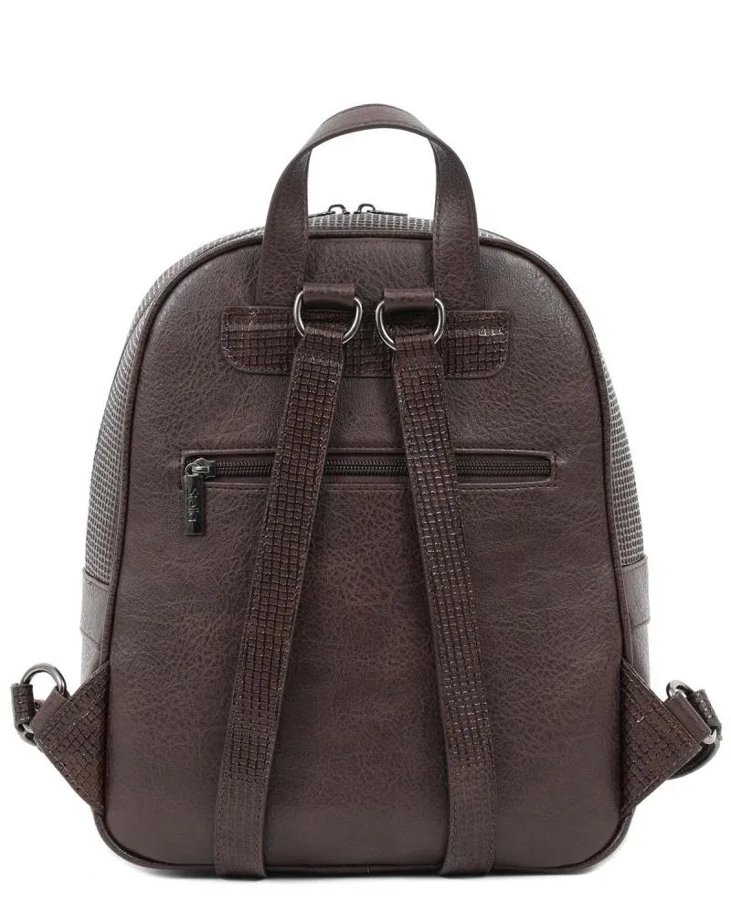 Γυναικεία τσάντα πλάτης σε καφέ χρώμα με ανάγλυφη υφή και εξωτερική τσέπη. Κατασκευασμένη από 100% pvc.