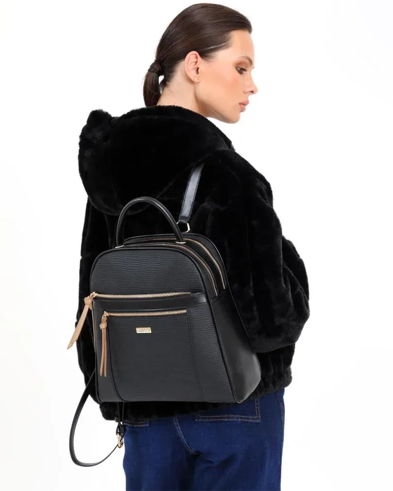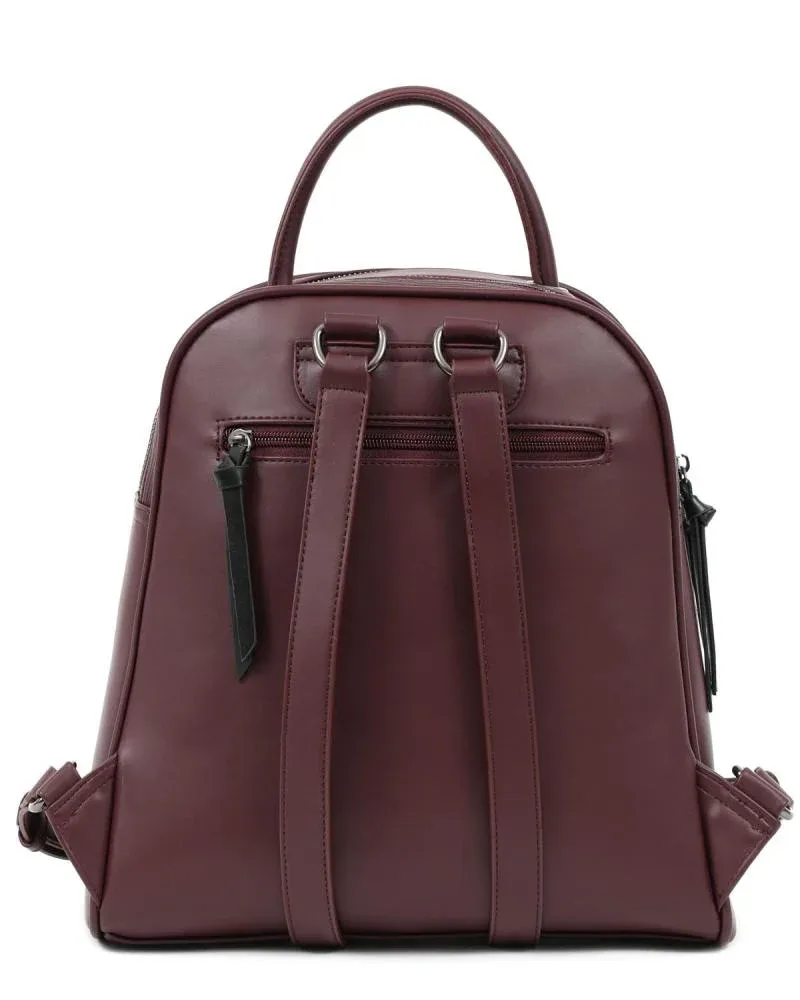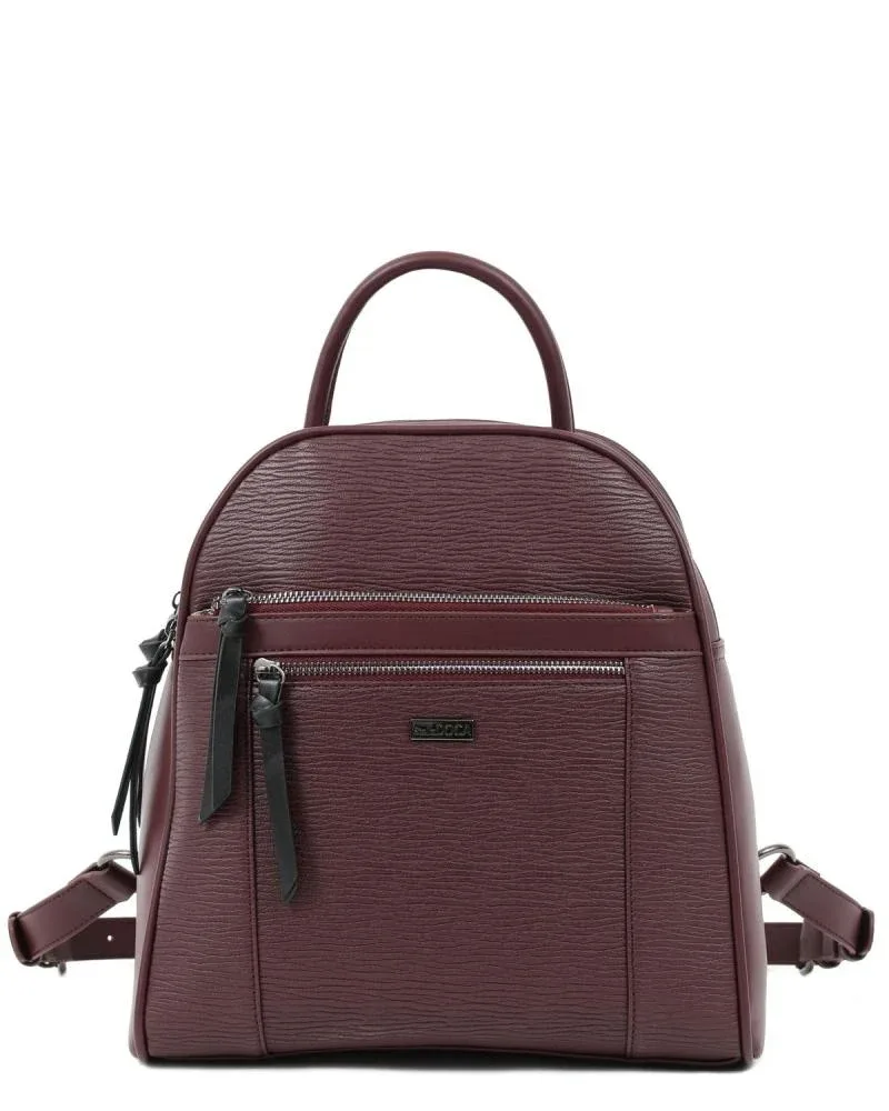 Γυναικεία τσάντα πλάτης σε μπορντώ χρώμα με τσέπες, ανάγλυφη υφή και διπλό φερμουάρ. Κατασκευασμένη από συνθετικό δέρμα.