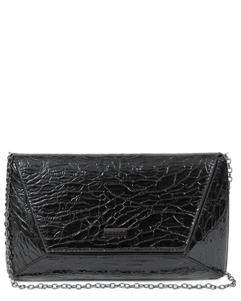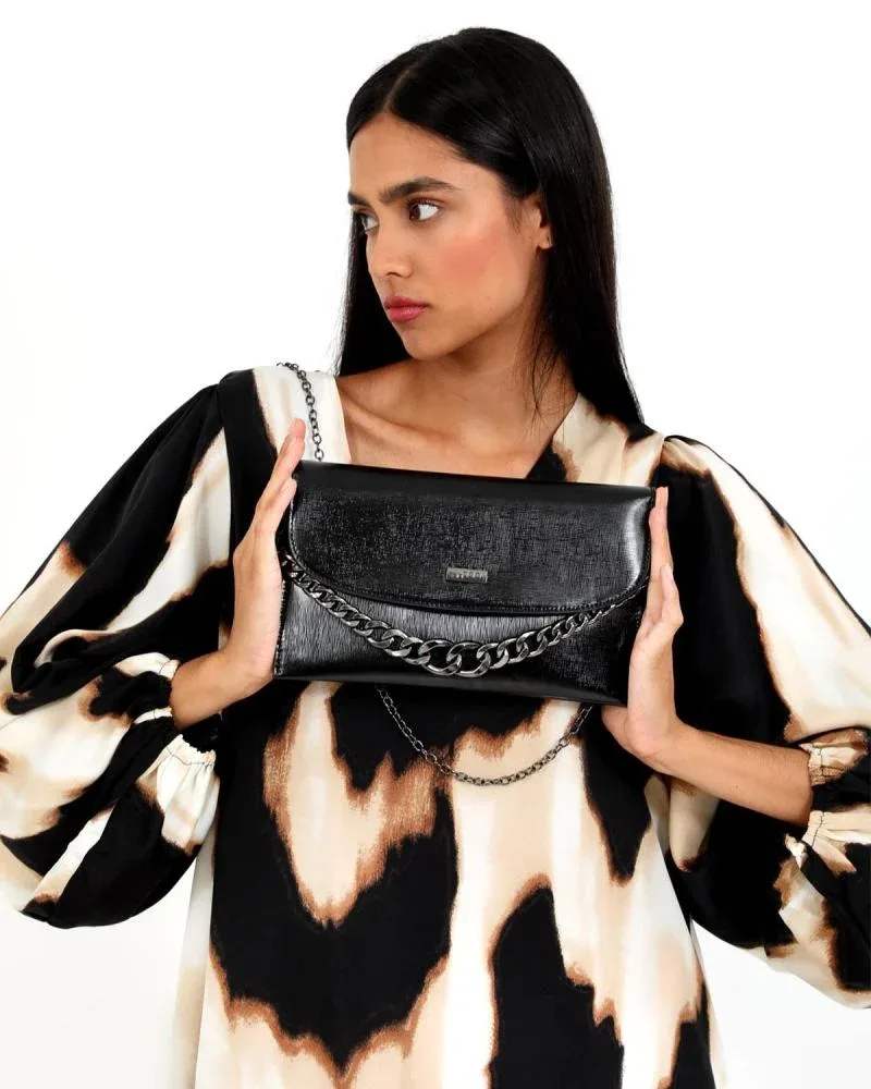 Αυτή η γυναικεία τσάντα φάκελος σε μαύρο χρώμα με κλείσιμο με καπάκι, ανάγλυφη υφή και αλυσίδα είναι ένα κομψό και πρακτικό αξεσουάρ.