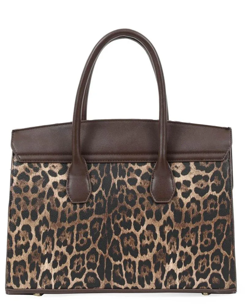 Γυναικεία τσάντα χειρός σε καφέ χρώμα με animal print, κλείσιμο με καπάκι και εξωτερική τσέπη. Κατασκευασμένη από συνθετικό δέρμα. Περιέχει επιπλέον ρυθμιζόμενο λουράκι για χρήση χιαστί.