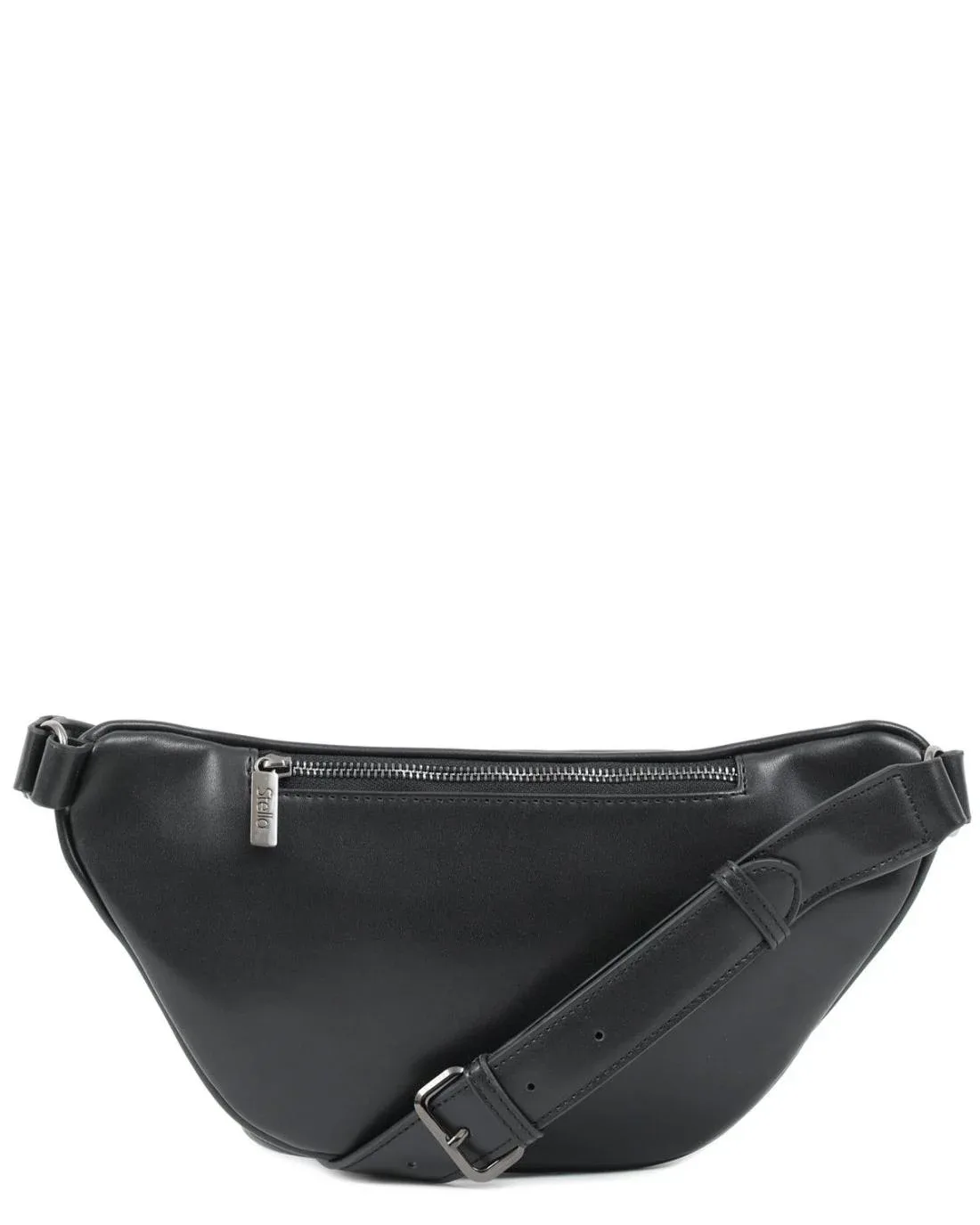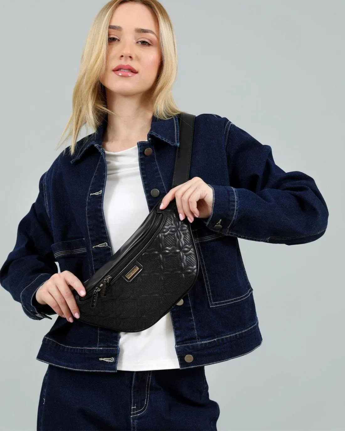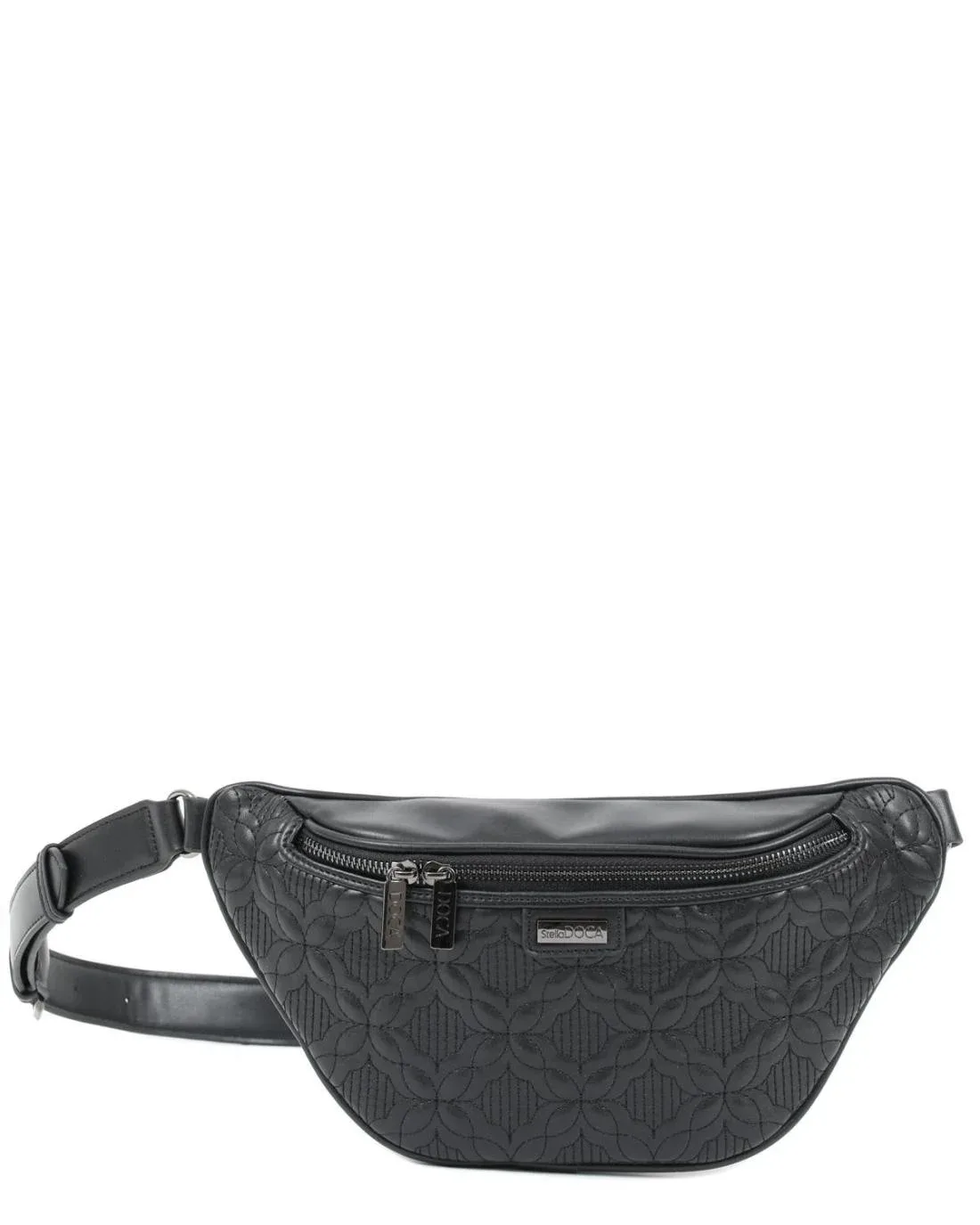 Γυναικείο τσαντάκι μέσης σε μαύρο χρώμα με εξωτερική τσέπη, διπλό φερμουάρ, καπιτονέ υφή, ρυθμιζόμενο λουράκι και γεωμετρικό σχέδιο. Κατασκευασμένο από συνθετικό δέρμα.