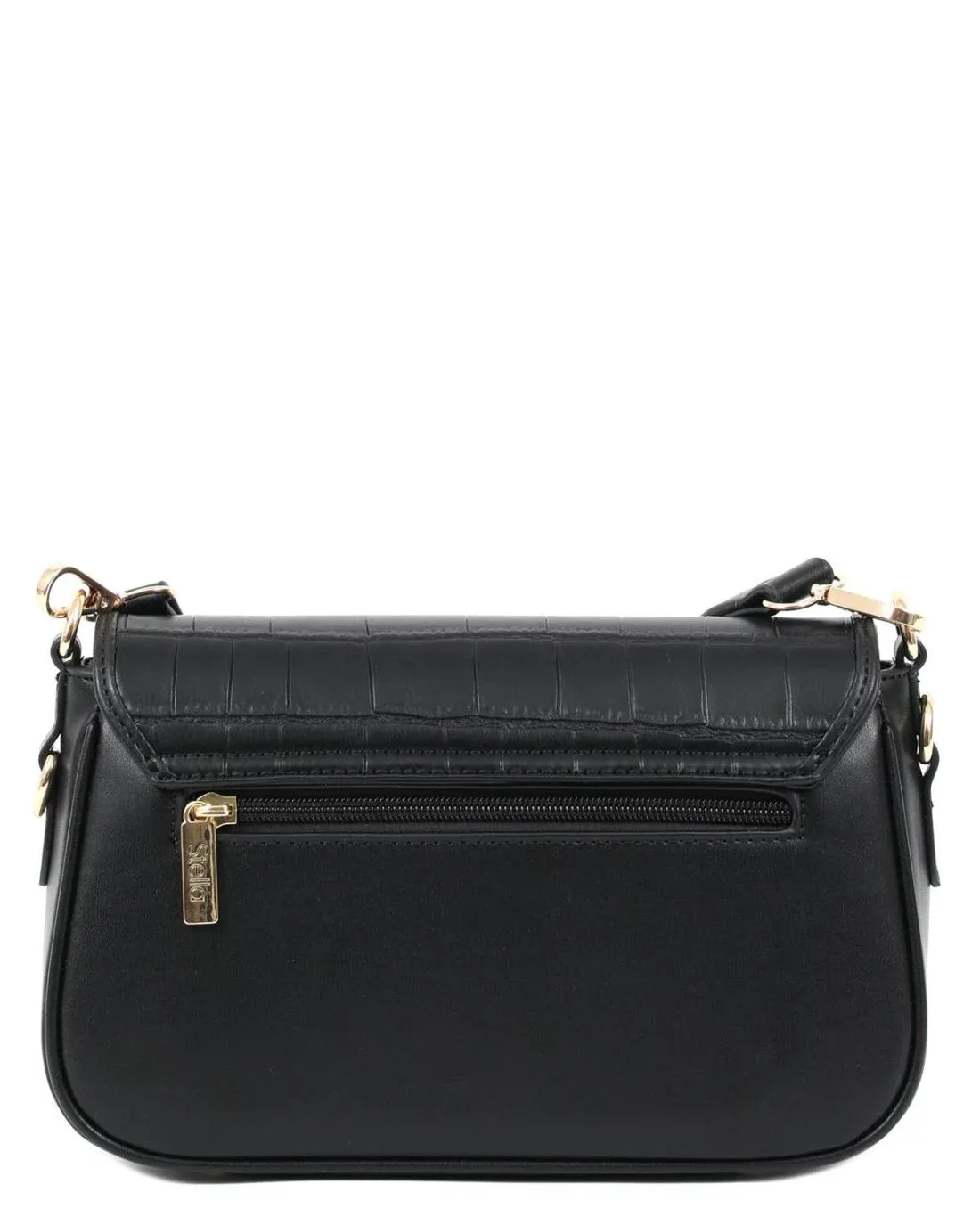 Γυναικεία τσάντα χιαστί σε μαύρο χρώμα με αποσπώμενο/ρυθμιζόμενο λουράκι, κλείσιμο με καπάκι, εξωτερική τσέπη και κροκό υφή. Κατασκευασμένη από συνθετικό δέρμα.