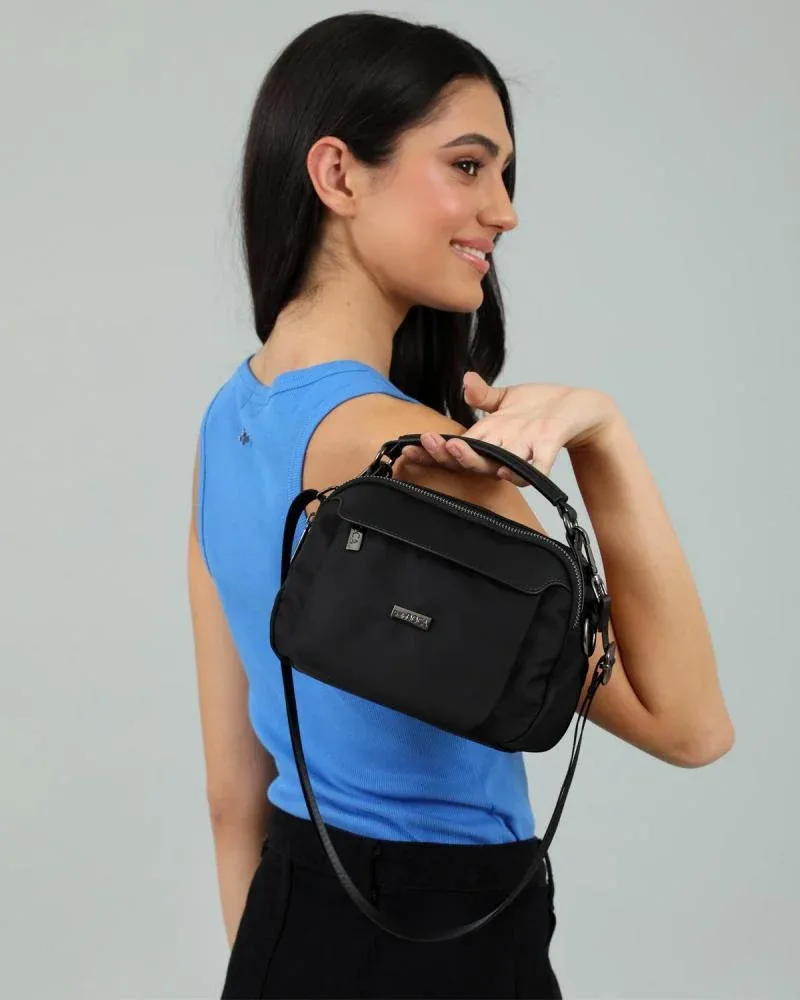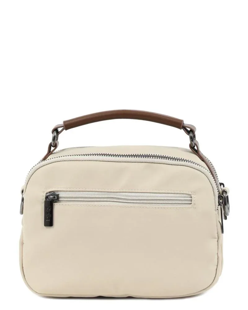 Γυναικεία τσάντα χιαστί σε μπεζ χρώμα με εξωτερική τσέπη, διπλό φερμουάρ και αποσπώμενο/ρυθμιζόμενο λουράκι. Κατασκευασμένη από 90% πολυεστέρα, 10% συνθετικό δέρμα.