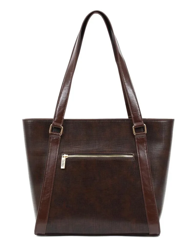 Γυναικεία τσάντα ώμου σε καφέ χρώμα με ανάγλυφη υφή και εξωτερική τσέπη. Κατασκευασμένη από συνθετικό δέρμα.
