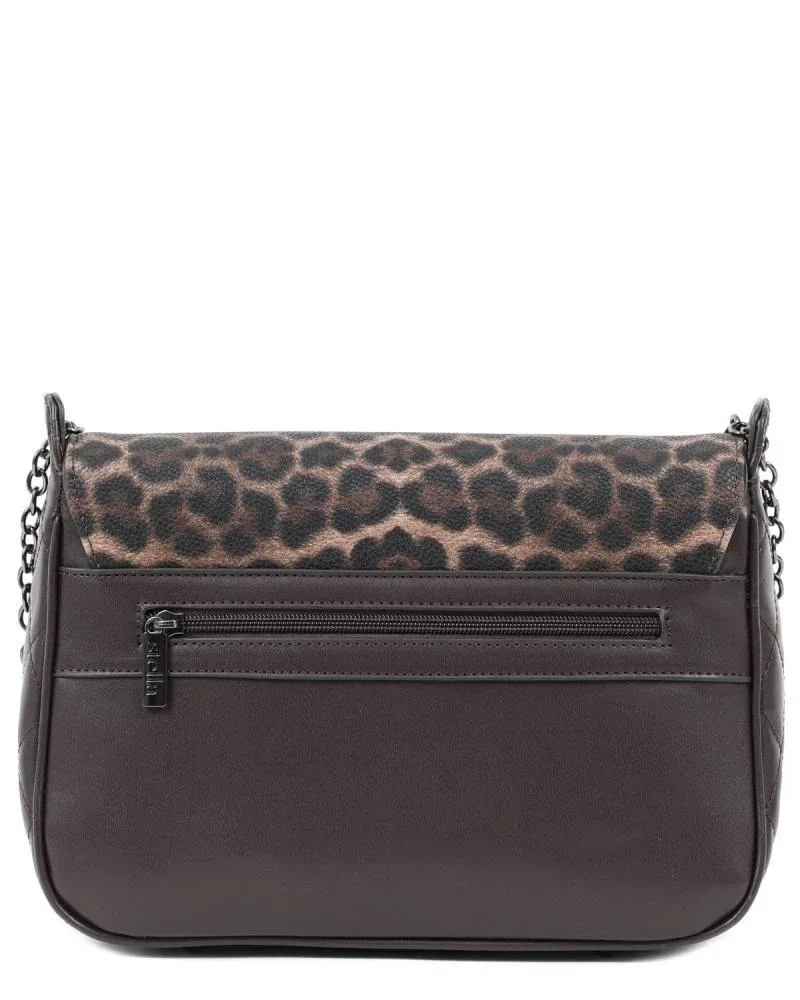 Γυναικεία τσάντα ώμου σε καφέ χρώμα με καπιτονέ υφή, εξωτερική τσέπη, κλείσιμο με καπάκι, αλυσίδα και animal print. Κατασκευασμένη από συνθετικό δέρμα.
