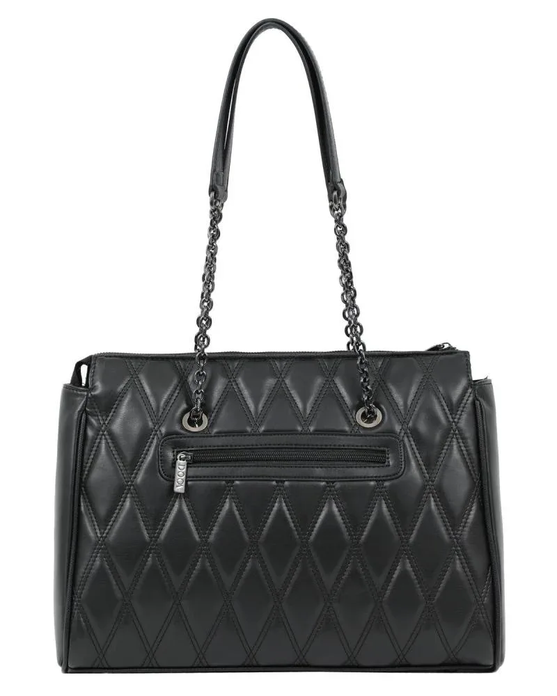 Γυναικεία τσάντα ώμου σε μαύρο χρώμα με εξωτερική τσέπη, καπιτονέ υφή, γεωμετρικό σχέδιο και αλυσίδα. Κατασκευασμένη από συνθετικό δέρμα.