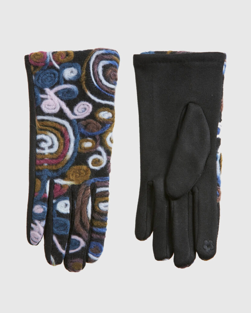 Αναδείξτε τη δημιουργική σας πλευρά με αυτά τα γάντια Verde, που ξεχωρίζουν με το αφηρημένο, πολύχρωμο μοτίβο τύπου ζωγραφιάς. Η υφή τύπου felt με ανάγλυφα νήματα σε έντονες αποχρώσεις συνδυάζεται αρμονικά με τη μονόχρωμη suede παλάμη, προσφέροντας ένα αξεσουάρ που τραβάει τα βλέμματα και προστατεύει από το κρύο.