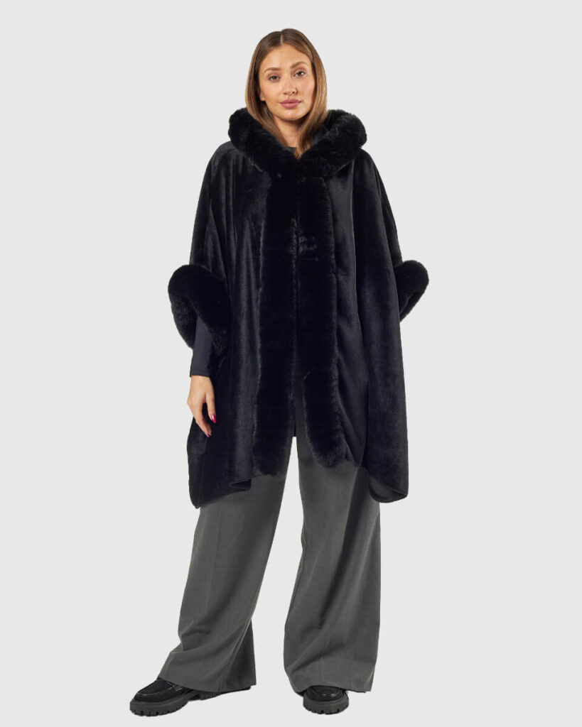 Κομψή και πολυτελής, αυτή η μαύρη κάπα από τη συλλογή Verde αποτελεί ένα κομμάτι-δήλωση για τις κρύες ημέρες. Το ύφασμα πολυεστέρα με υφή suede και η πυκνή, γυαλιστερή οικολογική γούνα στο γιακά, στα μανίκια και στην πατιλέτα προσδίδουν ζεστασιά και υψηλή αισθητική. Η κουκούλα και οι άνετες γραμμές προσφέρουν άψογη εφαρμογή και προστασία, ενώ οι πλαϊνές τσέπες ενισχύουν τη λειτουργικότητα. Ένα must-have για κάθε ενημερωμένη γκαρνταρόμπα.