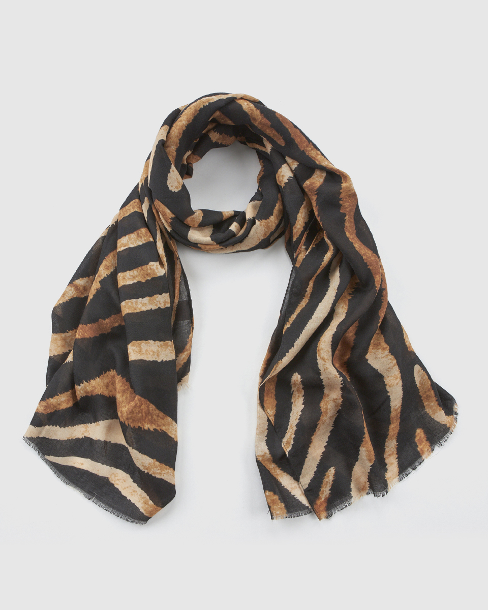 Μια δυναμική και μοντέρνα εσάρπα με tiger print σε αποχρώσεις του μαύρου, καφέ και μπεζ. Η ανάλαφρη υφή της και οι φυσικές γραμμές του σχεδίου προσδίδουν ένταση χωρίς υπερβολές, ενώ η φαρδιά της διάσταση την καθιστά ιδανική για εντυπωσιακά δεσίματα ή ριχτές εμφανίσεις.