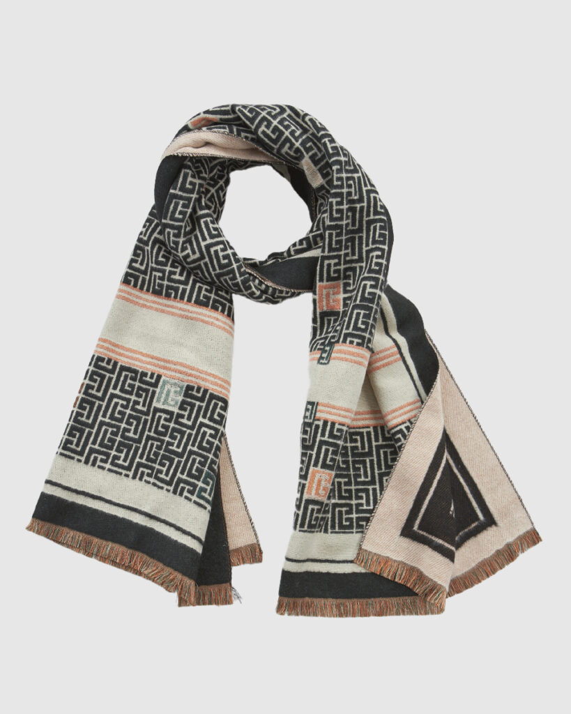 Ένα ιδιαίτερο κασκόλ με ανάγλυφο γεωμετρικό σχέδιο που συνδυάζει την παραδοσιακή αισθητική με σύγχρονα χρώματα και σχήματα. Το μοτίβο με συμμετρικά σύμβολα και η αντίθεση των χρωμάτων δημιουργούν εντυπωσιακό αποτέλεσμα. Ιδανικό για κάθε περίσταση, από casual μέχρι πιο προσεγμένες εμφανίσεις.