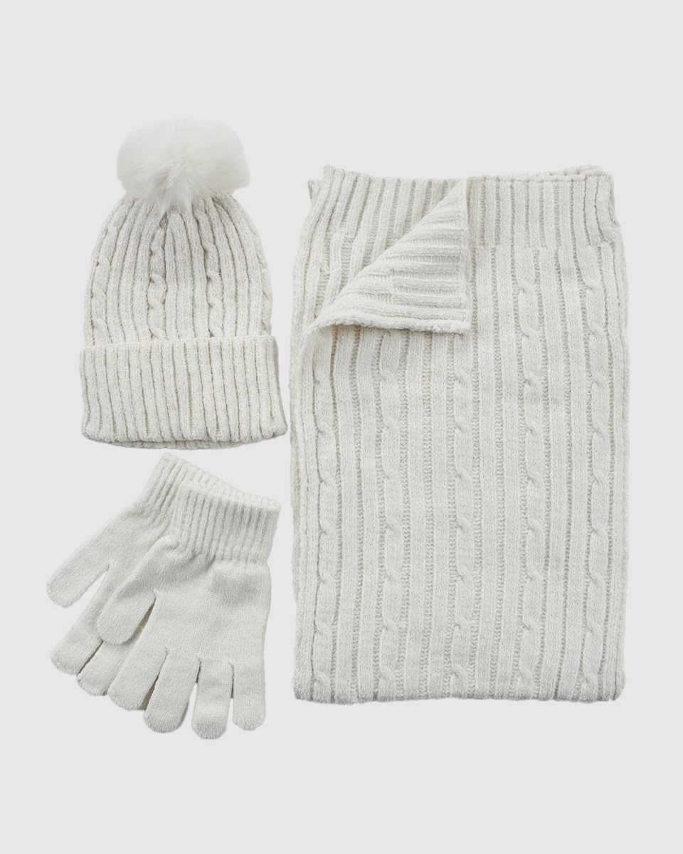 • Περιλαμβάνει: Κασκόλ, σκουφί με pom-pom και γάντια