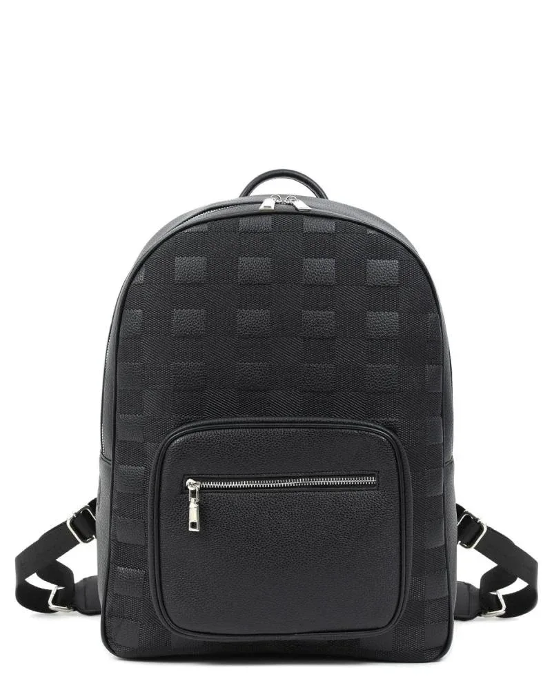 Ανδρική τσάντα πλάτης σε μαύρο χρώμα με εξωτερική τσέπη και ανάγλυφη υφή. Κατασκευασμένη από 70% συνθετικό δέρμα, 30% πολυεστέρα.