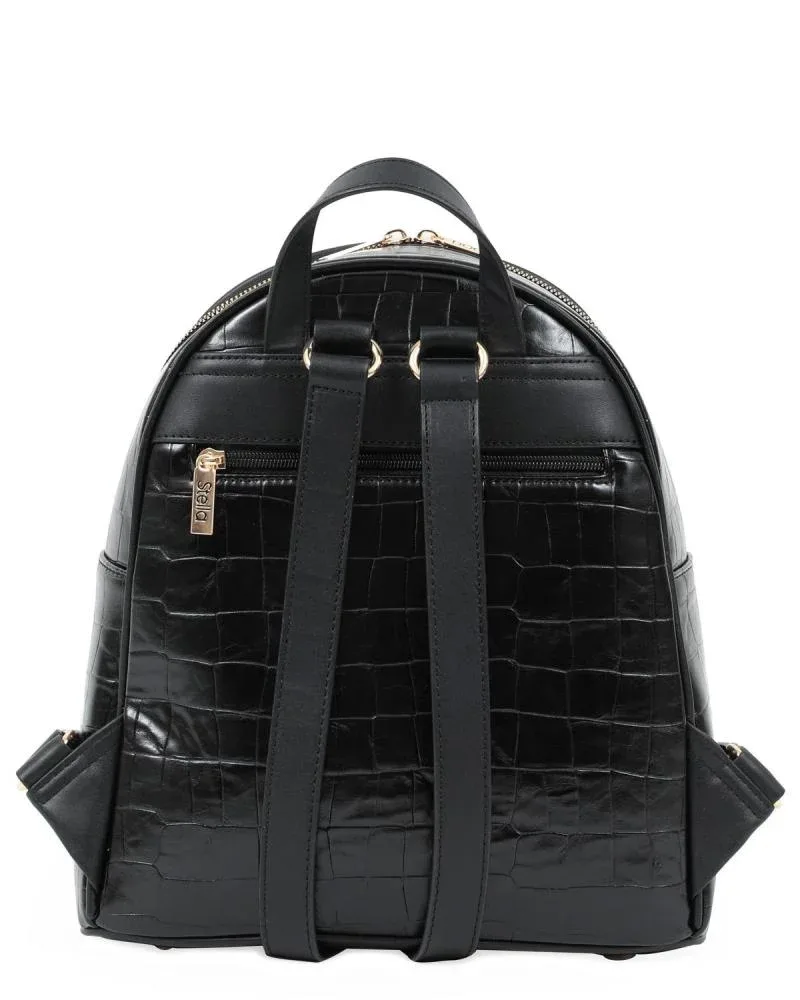 Γυναικεία τσάντα πλάτης σε μαύρο χρώμα με διπλό φερμουάρ, κροκό υφή, εξωτερική τσέπη και ρυθμιζόμενο λουράκι. Κατασκευασμένη από συνθετικό δέρμα.
