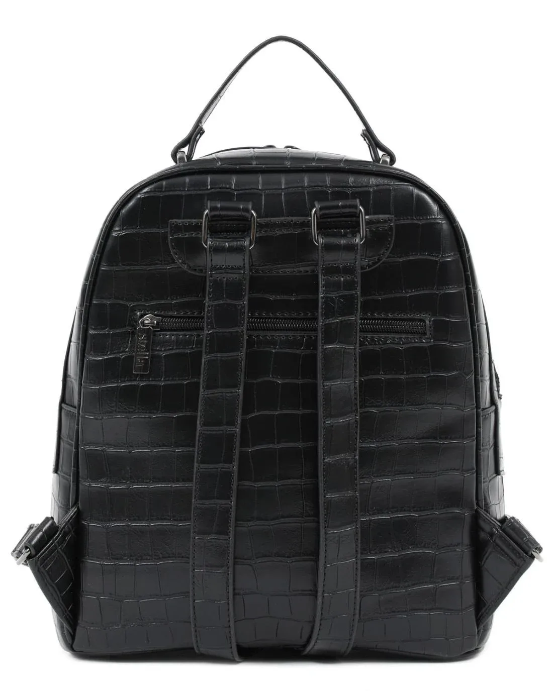 Γυναικεία τσάντα πλάτης σε μαύρο χρώμα με κροκό υφή, εξωτερική τσέπη και τρουκς. Κατασκευασμένη από 100% pvc.
