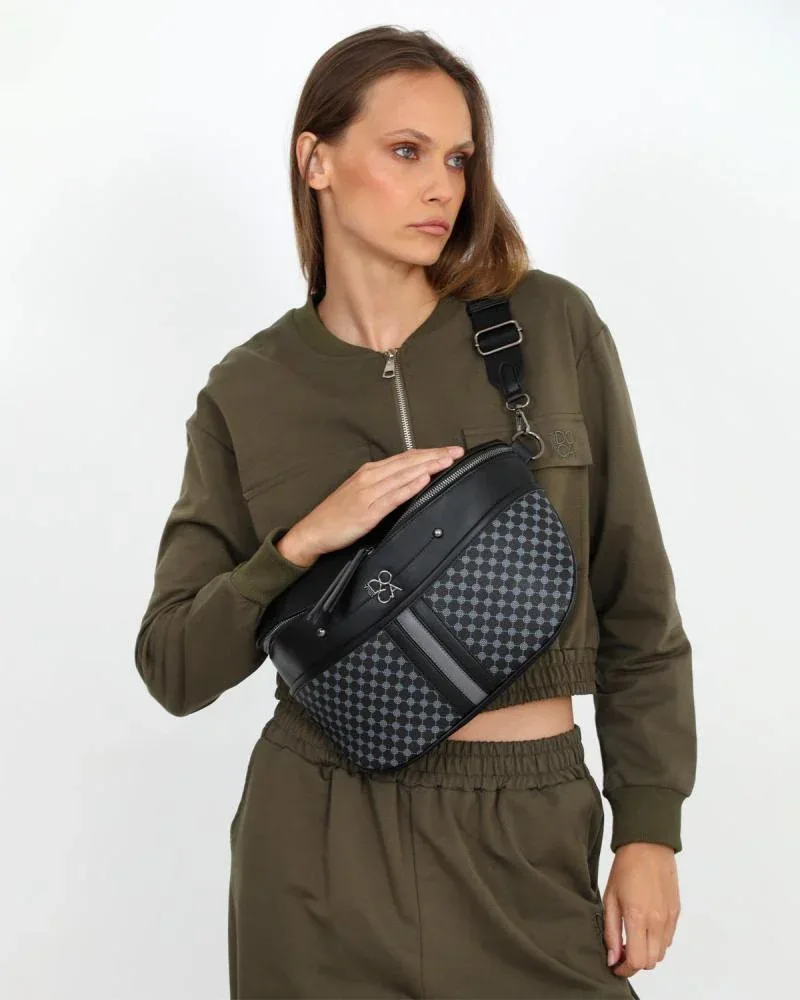 Γυναικείο τσαντάκι μέσης σε μαύρο χρώμα με εξωτερική τσέπη, διπλό φερμουάρ, τύπωμα και αποσπώμενο/ρυθμιζόμενο ιμάντα. Κατασκευασμένο από συνθετικό δέρμα.