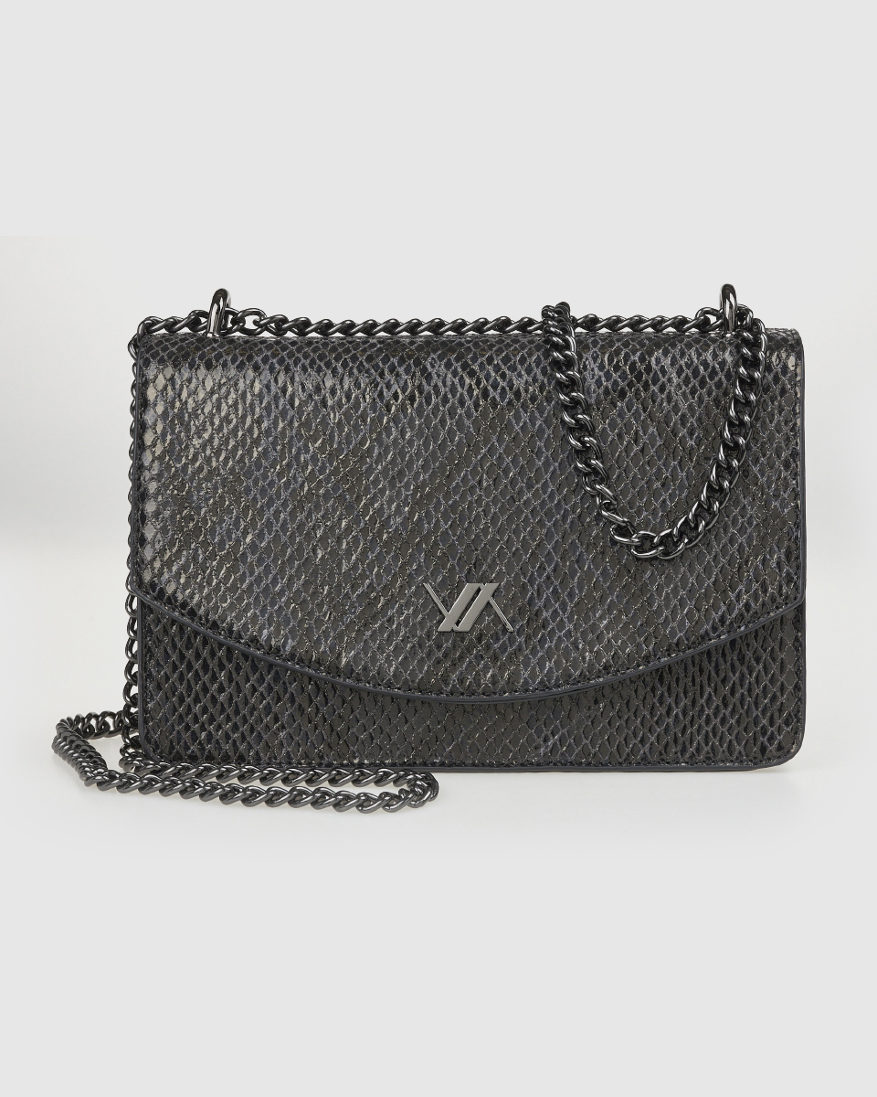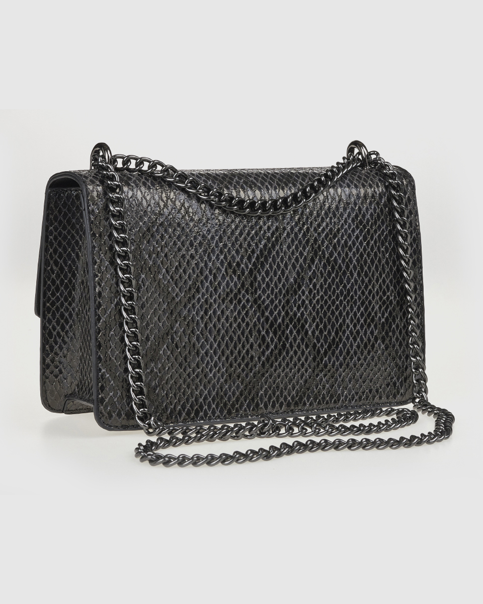 ανάγλυφο μοτίβο σε animal print και η μεταλλική αλυσίδα ώμου δημιουργούν ένα